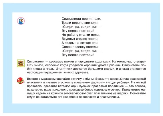 Любит ли ваш малыш разглядывать птичек на прогулке? А много ли птиц знаете вы и можете опознать? Этот комплект карточек познакомит вашего малыша, а возможно, и вас, с птицами нашей страны. Про каждую птицу известный петербургский поэт Людмила Дерягина написала стихотворение. А всего в комплекте целых 34 птицы. Также вы сможете познакомиться с интересными фактами из жизни птиц. Например, как о хорошо знакомых всем - воробья и вороны, так и о необычных вроде оляпки и завирушки. Кроме того, на каждой карточке вы найдете игру для развития мелкой моторики и речи.