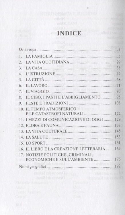 Пособие предназначено изучающим итальянский язык и владеющим им на уровнях А2-В2. Книга полезна также тем, кто хочет восстановить забытую лексику или, наоборот, овладеть незнакомой. В пособии разбираются повседневные разговорные темы, отражающие реалии современного мира.