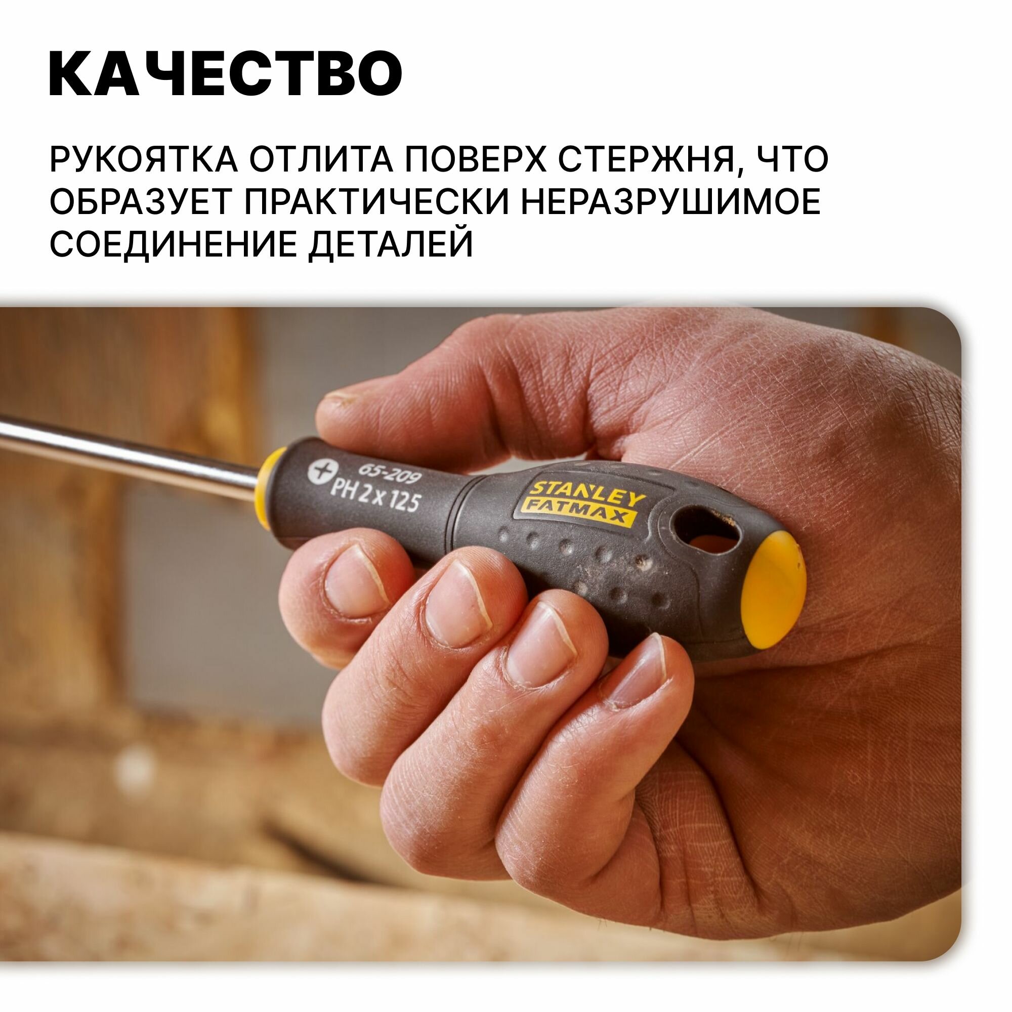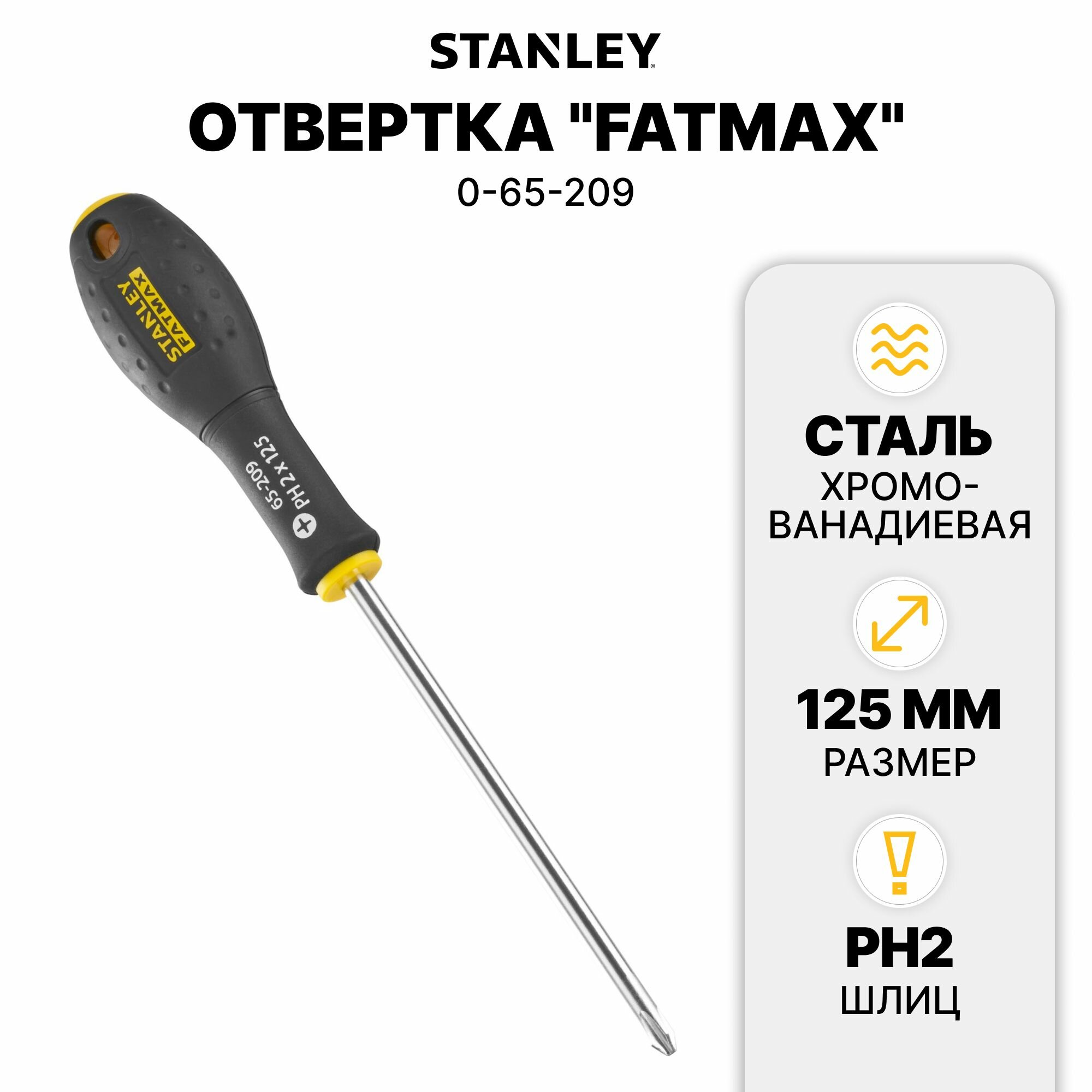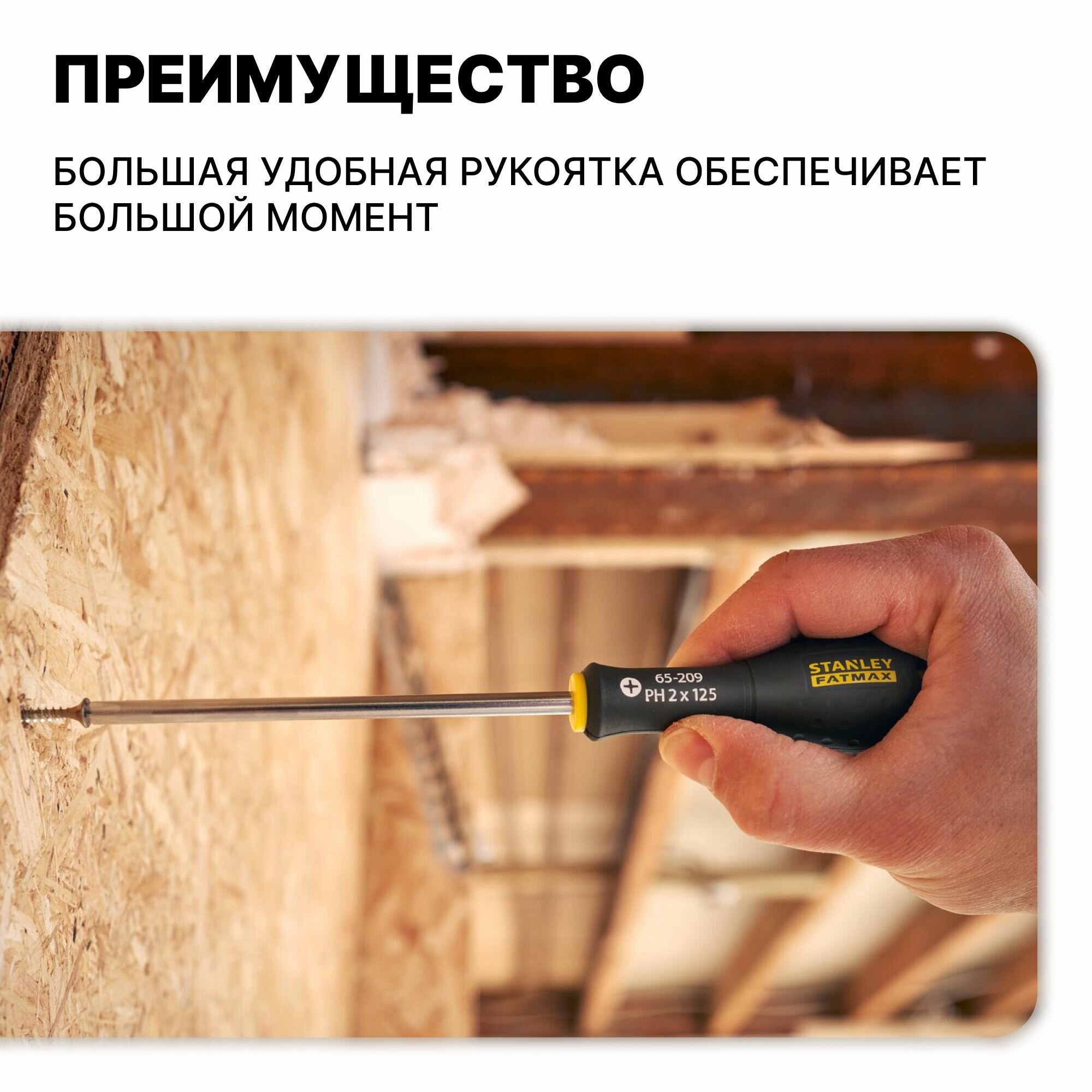**Отвертка Stanley Fatmax** позволяет закручивать крепежные элементы с крестообразной формой шлица размером PH2. Ручка изготовлена из двухкомпонентного пластика, дополненного прорезиненными вставками. Они исключают скольжение инструмента в ладони.