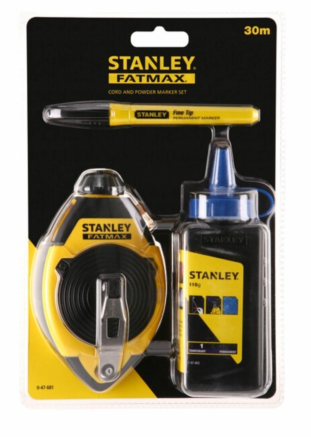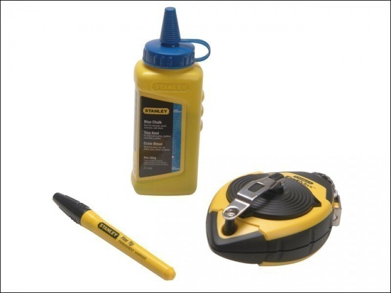 Набор из 3 предметов: шнуровка 30 м, краситель, маркер Stanley служит для проведения разметочных работ, пригодится на строительно-ремонтной площадке. На корпусе, выполненном из АБС-пластика, предусмотрены прорезиненные накладки - для комфортного удержания приспособления. Рукоять, при помощи которой осуществляется сматывание шнура, складывается внутрь корпуса, что удобно для хранения и при транспортировке. Шнур на конце оснащен крючком из нержавеющей стали. На корпусе есть смотровое окошко - для контроля уровня мелового порошка.