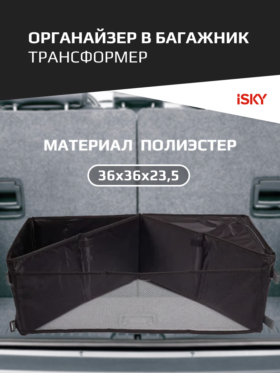 Если в вашем багажнике вечно не хватает места, органайзер –трансформер - идеальный выход. Он просто невероятно экономит место в багажнике. Его можно устанавливать как в форме квадрата, так и в форме треугольника. Есть боковые сетчатые кармашки и внутренняя перегородка. На дне органайзера располагаются «липучки» для фиксации органайзера в багажнике.