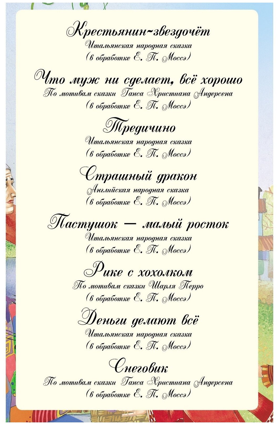 В книгу вошли сказки в обработке Е. П. Моссэ: "Крестьянин-звездочёт", "Тредичино", "Пастушок - малый росток", "Деньги делают всё" (итальянские народные сказки), "Что муж ни сделает, всё хорошо", "Снеговик" (по мотивам сказок Ганса Христиана Андерсена), "Страшный дракон" (английская народная сказка), "Рике с хохолком" (по мотивам сказки Шарля Перро).