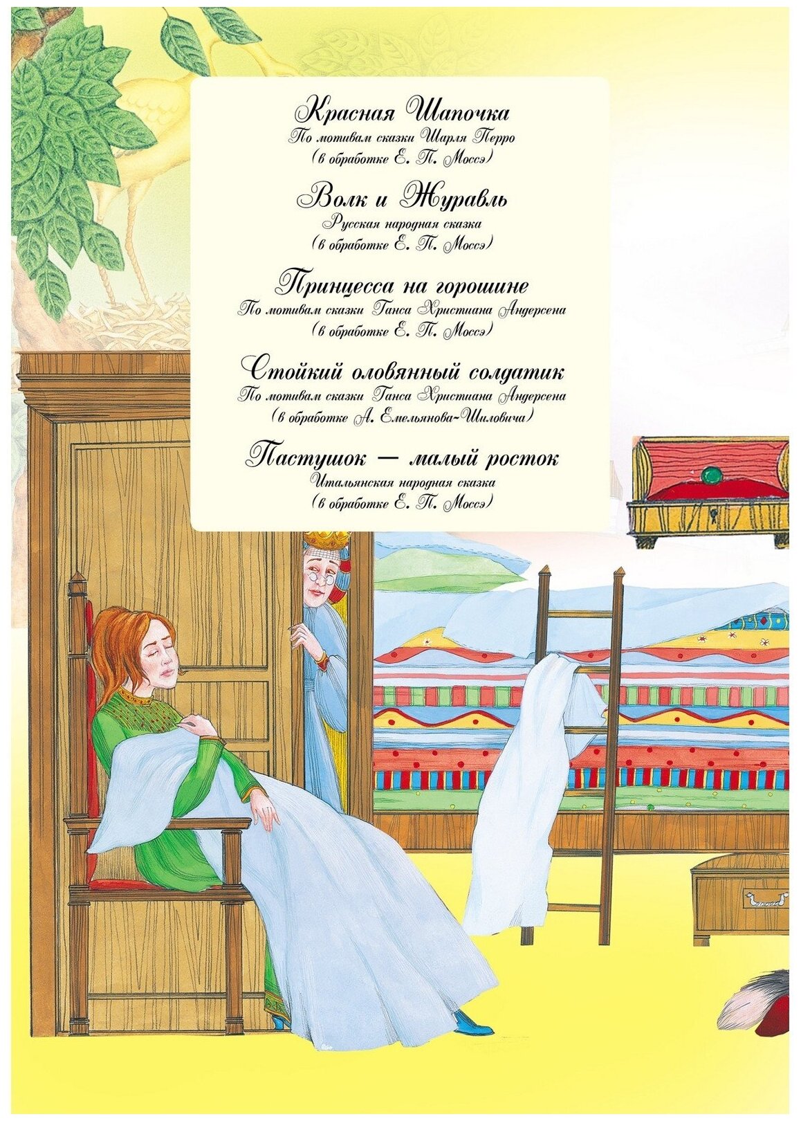 В книгу вошла сказка в обработке А. Емельянова-Шиловича "Стойкий оловянный солдатик" (по мотивам сказки Ганса Христиана Андерсена) и сказки в обработке Е. П. Моссэ: "Красная Шапочка" (по мотивам сказки Шарля Перро), "Принцесса на горошине" (по мотивам сказки Ганса Христиана Андерсена), "Волк и Журавль" (русская народная сказка), "Пастушок - малый росток" (итальянская народная сказка).