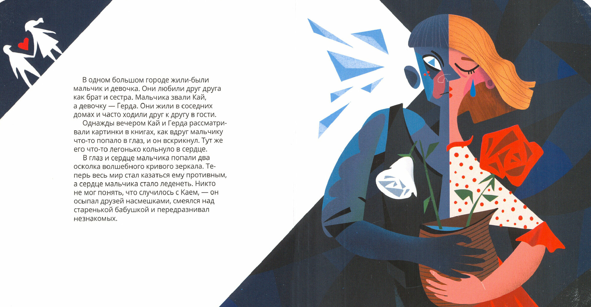 Угловатые и страстные картины Пикассо в манере кубизма стали источником вдохновения для иллюстратора, создавшего свои рисунки к сказке «Снежная королева», чтобы передать художественным языком и геометрическими форматами рассказ о девочке Герде и мальчике Кае.