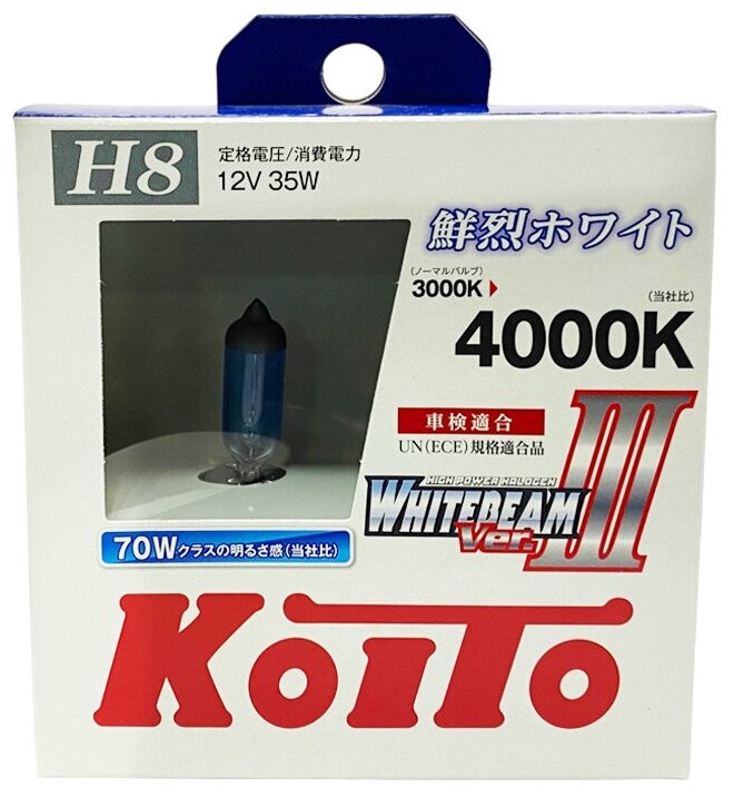 Компания KOITO выпускает все разновидности ламп и предохранителей для всех моделей японских автомобилей, а также широкий ассортимент для европейских и американских автомобилей. В ассортименте KOITO есть как лампы стандартной комплектации, так и лампы особых серий, таких как VWHITE и WHITEBEAM. Лампы особых серий VWHITE и WHITEBEAM обеспечивают удвоенную яркость при стандартной мощности. Эти лампы соответствуют всем нормам и стандартам, в том числе, и по потребляемой мощности. Эти лампы называются высокотемпературными, потому что при их работе цветовая температура газа достигает 4200 Кельвинов. При этом температура нагрева ламп не превышает допустимые производителем стандартные значения.