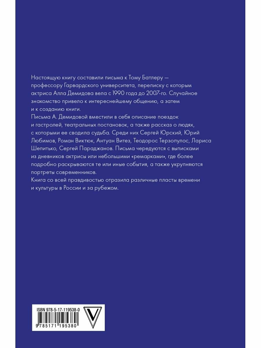 Настоящую книгу составили письма к Тому Батлеру - профессору Гарвардского университета, - переписку с которым актриса Алла Демидова вела с 1990 года до 2007-го. Случайное знакомство привело к интереснейшему общению, а затем и к созданию книги.