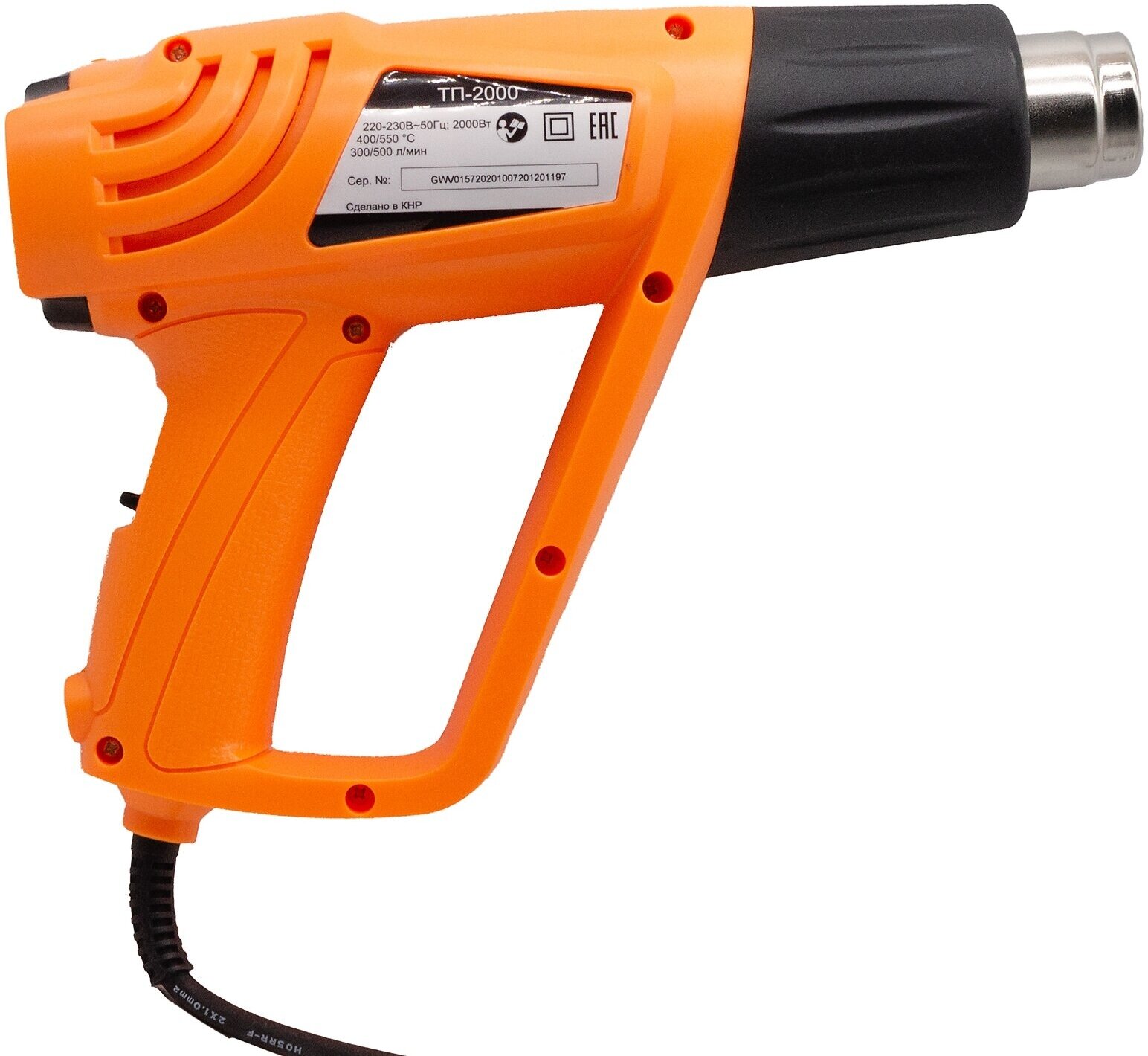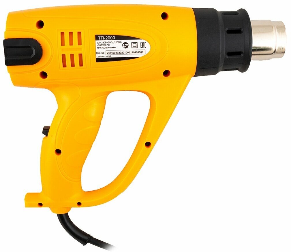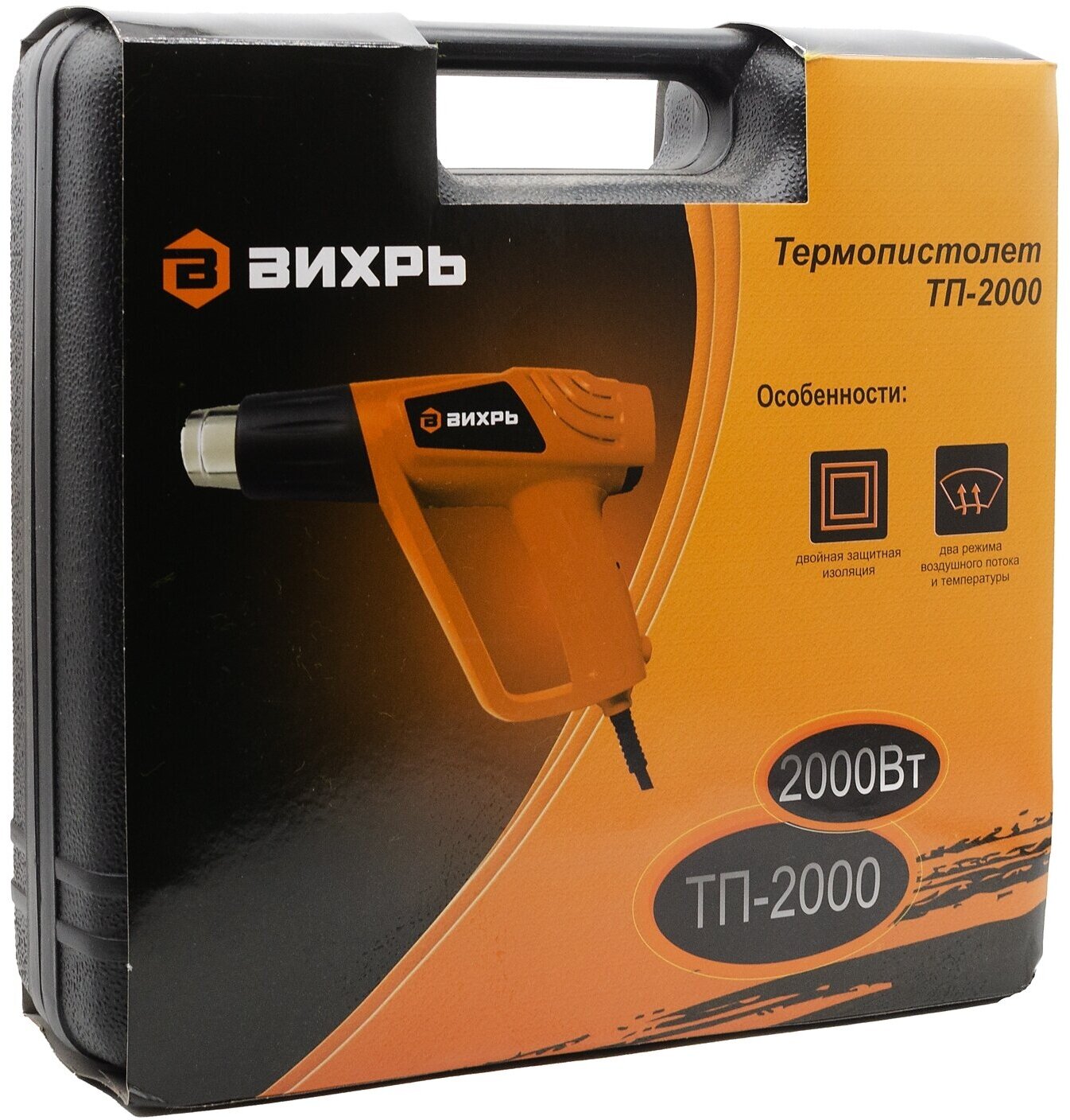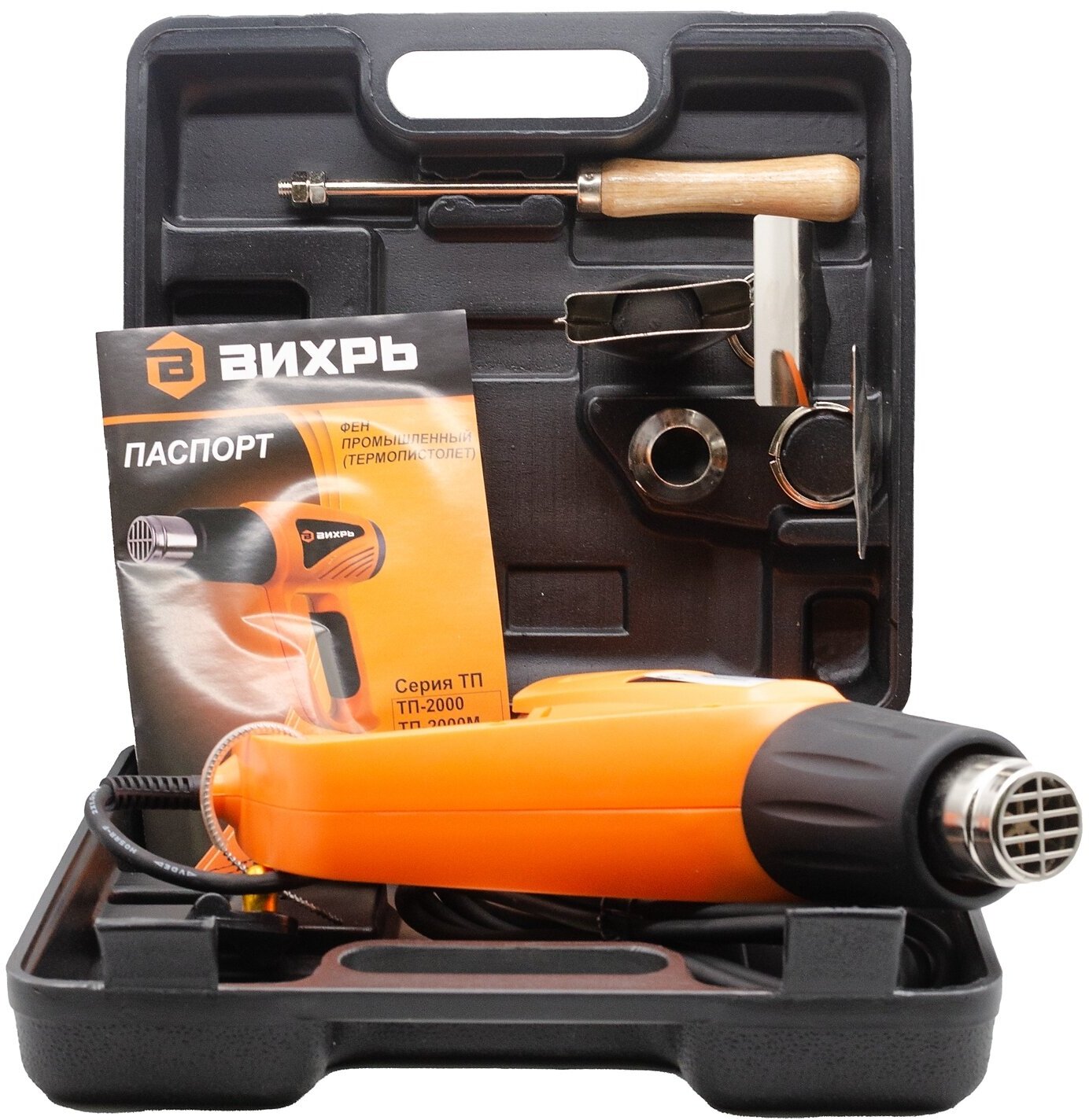 Термопистолет (фен промышленный) ВИХРЬ ТП-2000 – ручной электроинструмент для обработки горячим воздухом поверхностей и материалов, для удаления красок, формования и сварки пластмассы, нагревания термоусадочных труб; инструмент также подходит для пайки и лужения, размягчения клеевых соединений (швов), а также размораживания водопроводных труб. Термопистолет предназначен для эксплуатации при температуре окружающей среды от -10°С до +40°С, относительной влажности воздуха не более 80% и отсутствии прямого воздействия атмосферных осадков и чрезмерной запылённости воздуха.