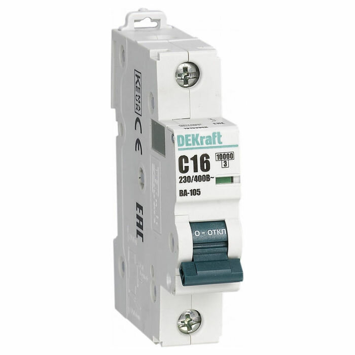 Автоматический выключатель серии ВА-105 DEKraft; 1P; ном. ток 16 А; характеристика C; откл. способность Icn = 10 кА; установка – на DIN-рейку; ширина – 1 мод. х 18мм. Преимуществом выключателей ВА-105 является их высокая механическая и электрическая износостойкость — в 20 000 и 10 000 циклов соответственно. Аппараты ВА-105 имеют возможность применения независимых расцепителей на переменный и постоянный ток, а также возможность установки устройств на аппараты гребенчатых шин типа PIN.