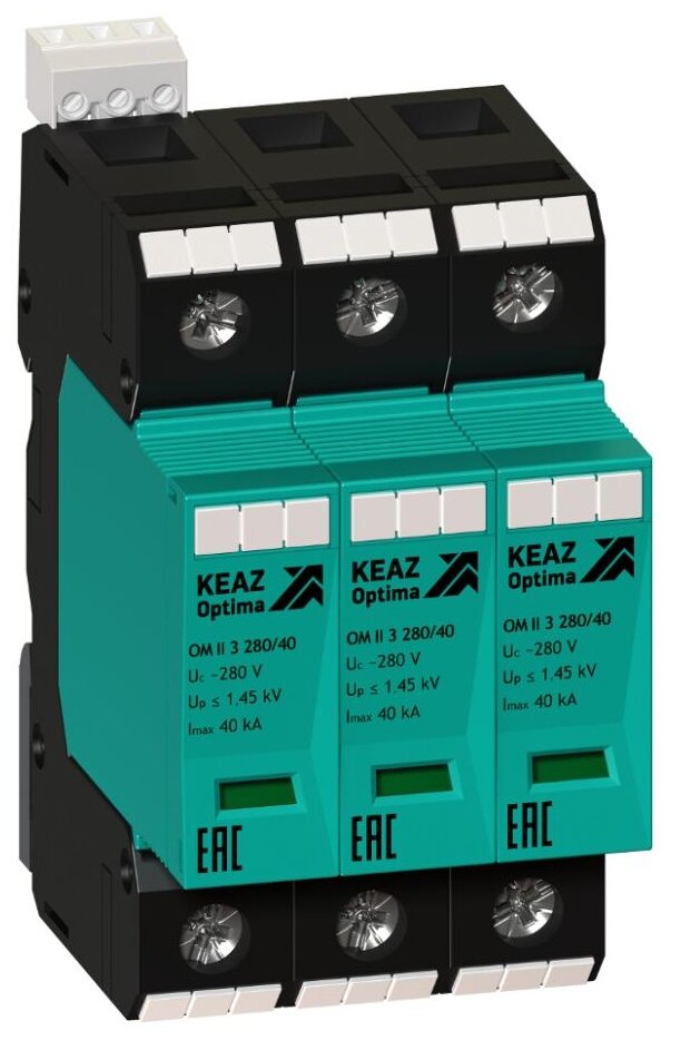 Ограничитель импульсных перенапряжений (УЗИП) OptiDin OM I 3 280/12.5 КЭАЗ 114242Устройство защиты от импульсных перенапряжений класса I + II + III с типом полюса 3P и трехфазной питающей сетью.