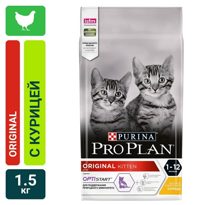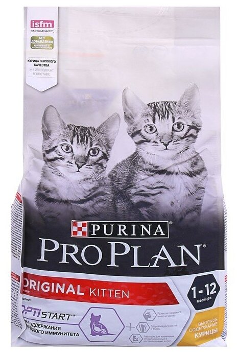 Кормления котенка отличается от кормления взрослой кошки или кота: для него необходимо намного большее количество протеинов (белка) и кальция. Корм PRO PLAN® для котят обеспечивает все потребности растущего организма питомца благодаря высокому содержанию белка, а также сочетанию необходимых питательных веществ, в том числе витаминов С и D, а также антител и омега-3 жирных кислот. Формула OPTISTART® поддерживает природный иммунитет котенка благодаря молозиву в составе, которое улучшает баланс кишечной микрофлоры и стимулирует местный кишечный иммунитет.