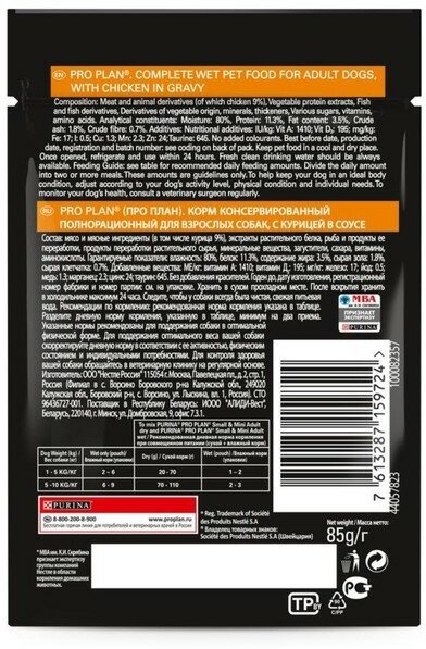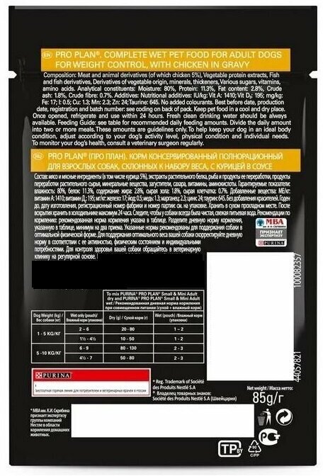 Корм с натуральными пребиотиками для поддержания правильного пищеварения. Разработан специально для собак мелких и карликовых пород, склонных к избыточному весу: пониженное содержание жиров помогает поддерживать оптимальный вес. Не содержит искусственных красителей. Рекомендации по кормлению вес (кг) паучи (шт) смешанный рацион сухой корм (г) + влажный (пауч) 1-5 2-5 14-62 1-2 5-10 5-8 62-102 2-3 Разделите дневную норму кормления минимум на два приема. Для поддержания правильного веса собаки скорректируйте дневную норму в соответствии с ее активностью, физическим состоянием и индивидуальными потребностями. Регулярно проверяйте здоровье питомца у ветеринарного врача. Следите, чтобы у собаки всегда была свежая питьевая вода.