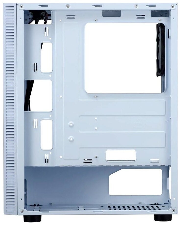 На корпусе ATX FORMULA RGB предусмотрено 3 USB-разъема и аудиовыход. Все они находятся на фронтальной панели. Здесь можно установить 3 вентилятора по 120 мм на передней панели. Также допускается монтаж аналогичных вентиляторов по две штуки на нижней и верхней панелях. Блок питания в такой модели не установлен, его можно расположить внизу.