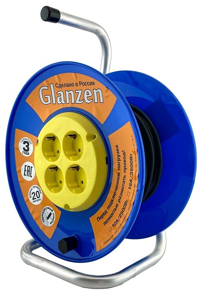 Удлинитель на катушке Glanzen с предельной нагрузкой 3500 Вт и трехжильным кабелем длиной 20 м способен обеспечить работу до 4 электроприборов одновременно. Катушка с удобной ручкой и подставкой, а также защита от брызг позволяют легко переносить и использовать удлинитель в любых погодных условиях при температуре от +1 до +35 градусов Цельсия.
