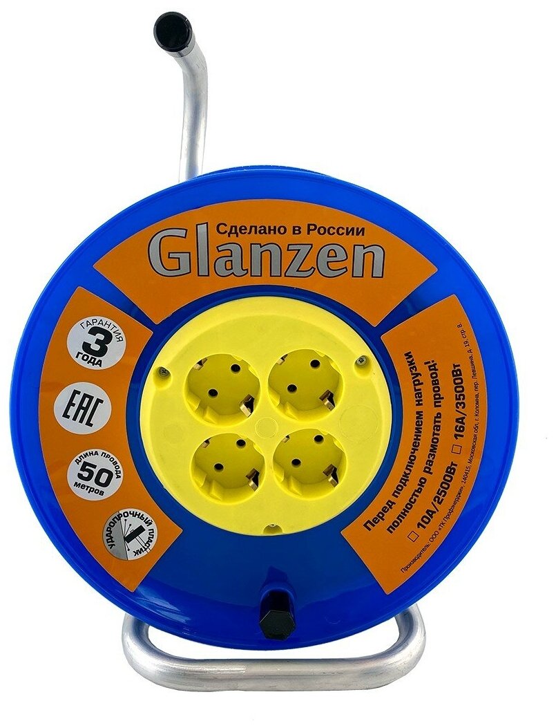 Сервис сравнения цен СкидкаГИД предлагает сравнить цены на товар «Удлинитель силовой на катушке GLANZEN 4 гн ПВС 3х15 мм 50 м EB-50-019»