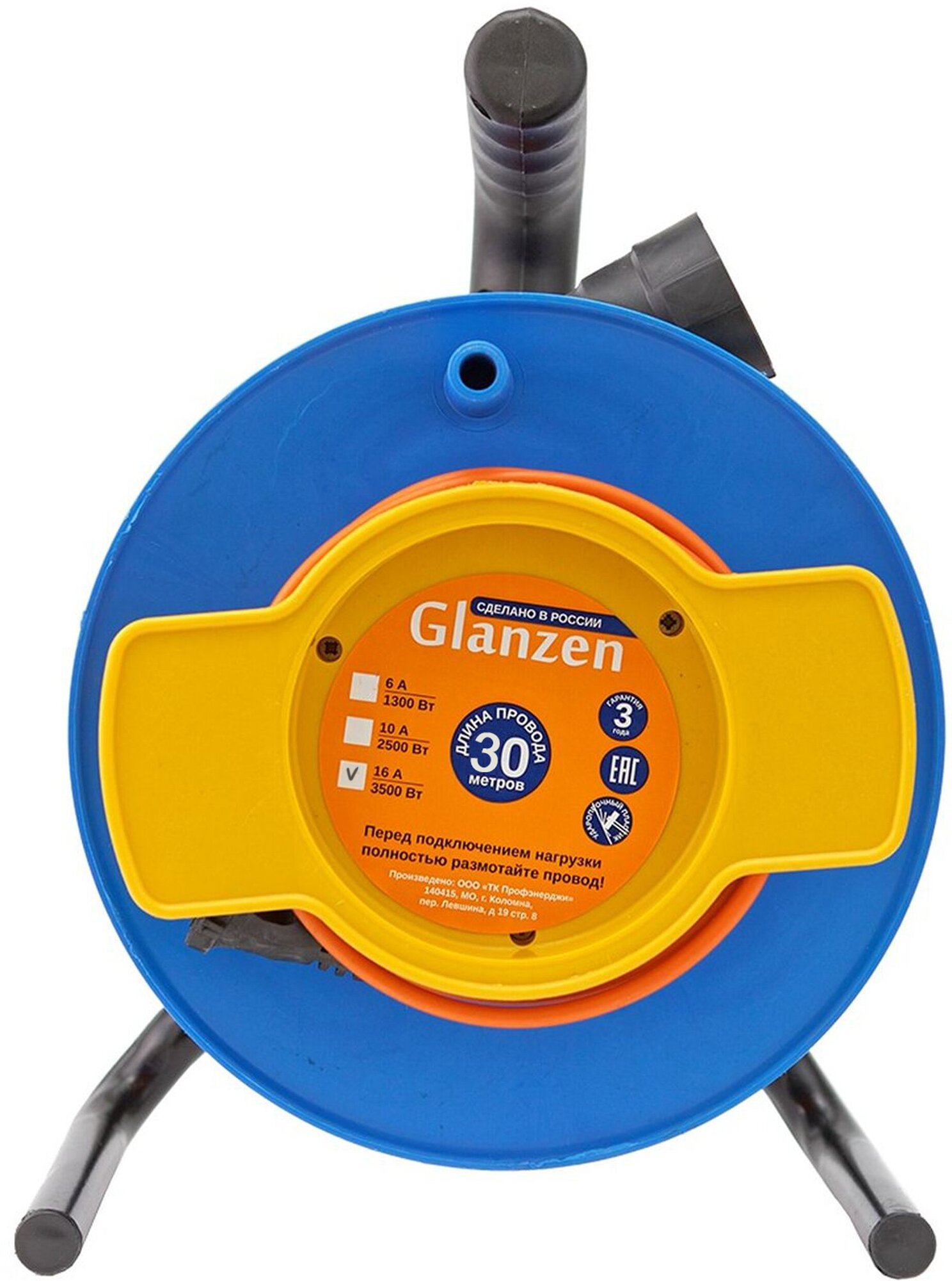 Удлинитель силовой на катушке GLANZEN ПВС 3х15 мм 30 м EC-30-003