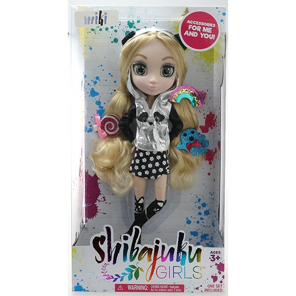 У куколки Мики длинные светлые прошитые волосы и большие серые глаза. Мики одета в черно-серебристую кофту с капюшоном и аппликацией панды и черную юбку в белый мелкий цветочек. На ногах черные гольфы с мордочками панды и туфельки. Высота игрушки 33 см.