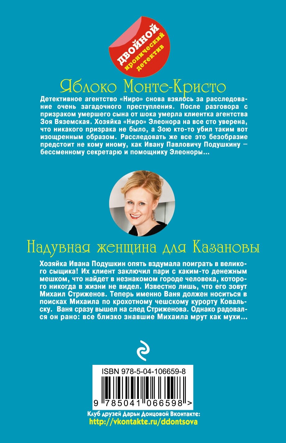 "Яблоко Монте-Кристо.Детективное агентство «Ниро» снова взялось за расследование очень загадочного преступления. После разговора с призраком умершего сына от шока умерла клиентка агентства Зоя Вяземская. Хозяйка «Ниро» Элеонора на все сто уверена, что никакого призрака не было, а Зою кто-то убил таким вот изощренным образом. Расследовать же все это безобразие предстоит не кому иному как Ивану Павловичу Подушкину – бессменному секретарю и помощнику Элеоноры…..Надувная женщина для Казановы.Хозяйка Ивана Подушкина, секретаря бизнес-вумен Норы, опять вздумала поиграть в великого сыщика! Их клиент заключил пари с каким-то денежным мешком, что найдет в незнакомом городе человека, которого никогда в жизни не видел. Известно лишь, что его зовут Михаил Стриженов. Теперь именно Ваня должен носиться в поисках Михаила по крохотному чешскому курорту Ковальску. Ваня сразу вышел на след Стриженова. Однако радовался он рано: все, близко знавшие Михаила, мрут, как мухи…"