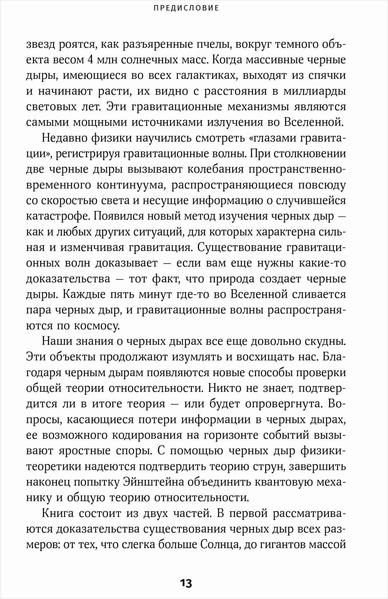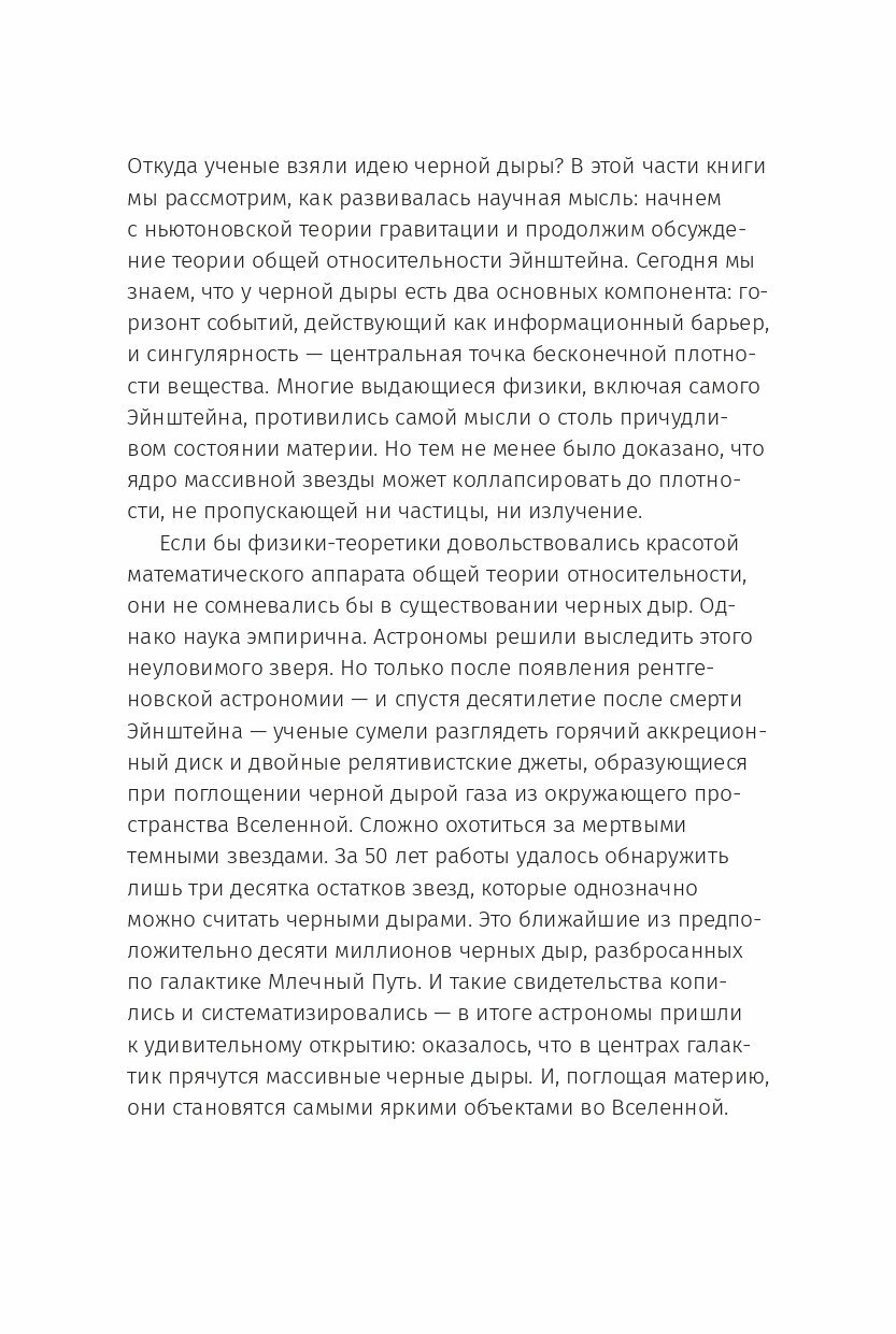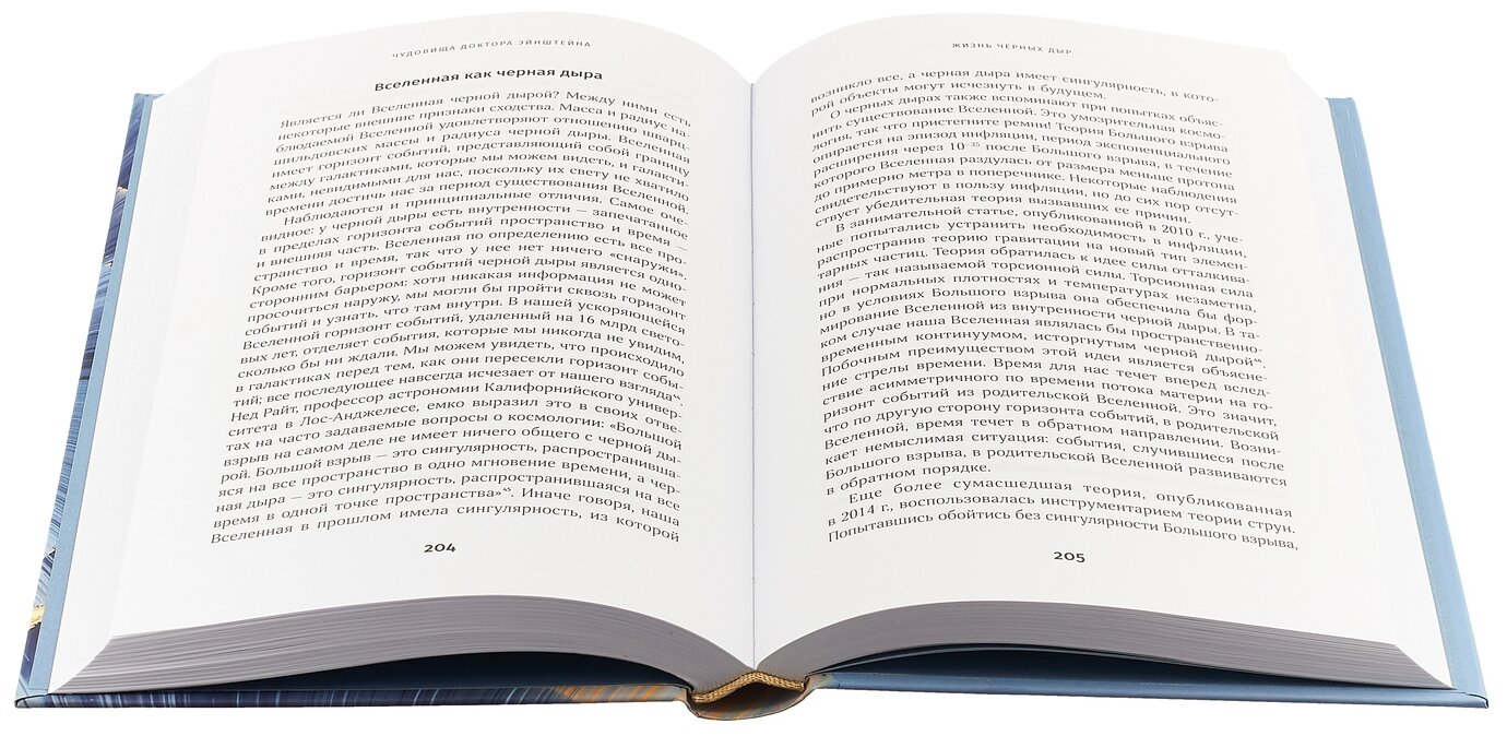 Очень увлекательная и интересная научно-популярная книга по физике и астрономии. Она доступно и понятно описывает такие загадочные и сложные объекты, как чёрные дыры. Книга состоит из двух частей. В первой части описываются свидетельства и факты, указывающие на существование чёрных дыр, а также развитие научных представлений о чёрных дырах. Во второй - эволюция чёрных дыр, их жизнь и будущее, а также влияние чёрных дыр на окружающий космос. Книга сделана довольно качественно, плотная белая офсетная бумага, есть чёрно-белые иллюстрации. Книга очень подойдёт всем, кто увлекается физикой и астрономией.