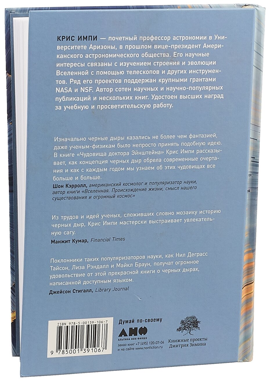 Крис Импи — почетный профессор астрономии в Университете Аризоны, в прошлом вице-президент Американского астрономического общества. Его научные интересы связаны с изучением строения и эволюции Вселенной с помощью телескопов и других инструментов. Изначально черные дыры казались не более чем фантазией, даже ученым-физикам было непросто принять подобную идею. В книге "Чудовища доктора Эйнштейна" Крис Импи рассказывает, как концепция черных дыр обрела современные очертания и как с каждым годом мы узнаем об этих чудовищах все больше и больше. Это и история науки и передний край сегодняшних исследований чёрных дыр и то, что нам предстоит узнать о них в самое ближайшее время.