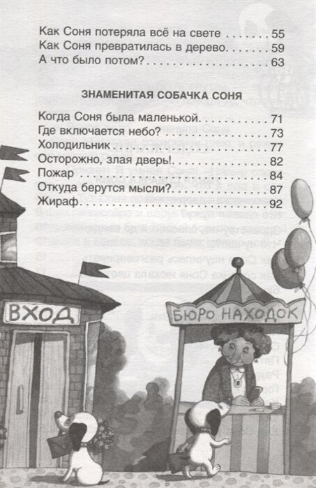Собачка Соня - очень умная собачка. Почему? Да потому, что она обо всем раздумывает, а если много думать, то непременно станешь умным. Но, несмотря на ее раздумья, а может, из-за них, Соня постоянно попадает в самые забавные ситуации. В книгу вошли циклы рассказов «Умная собачка Соня» и «Знаменитая собачка Соня».