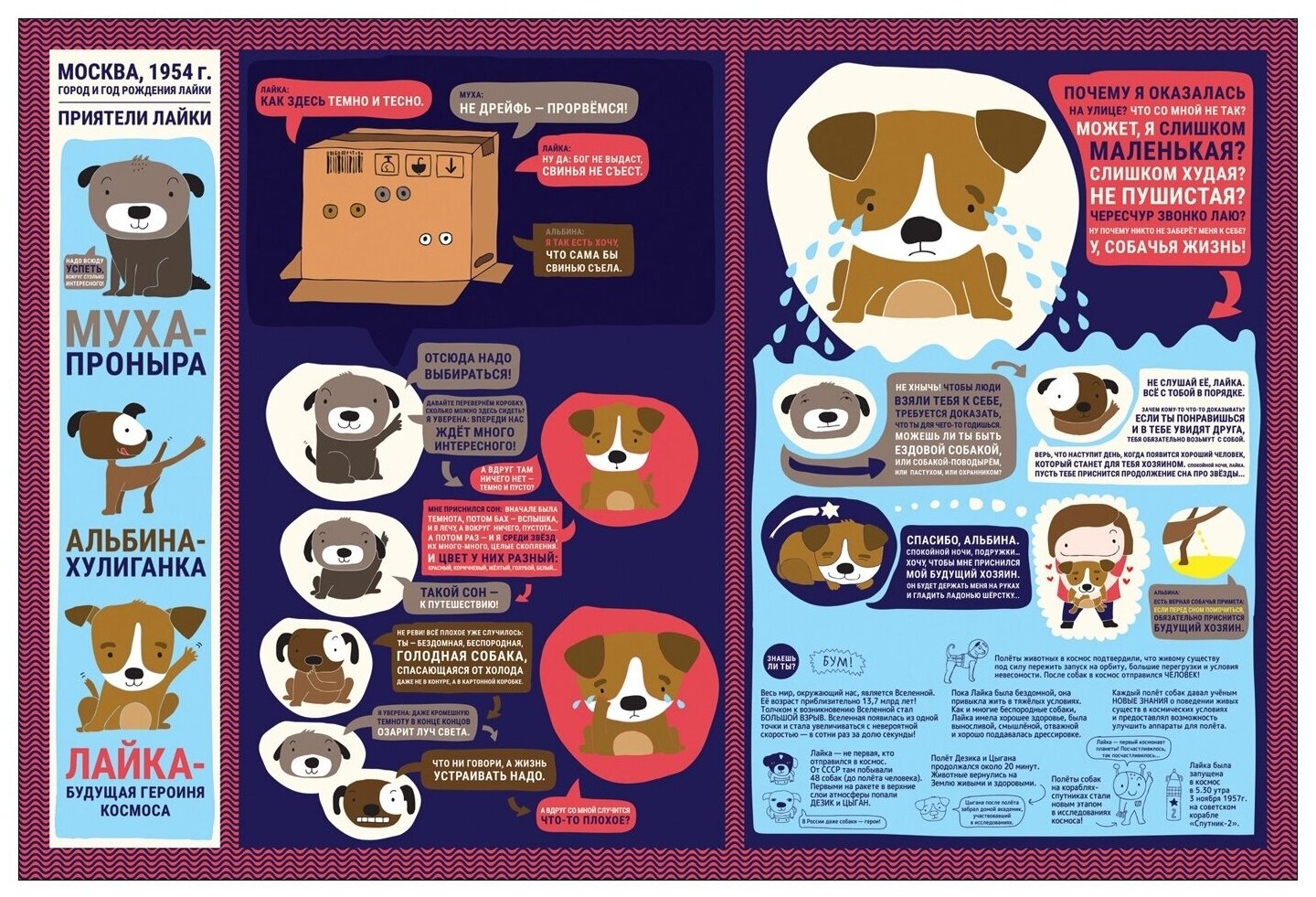Книга посвящена Лайке — собаке, совершившей полёт в космос. Её путешествие на орбиту Земли стало знаменательным моментом в истории человечества. Свою короткую жизнь она отдала науке. Благодаря ей учёные получили новые знания о поведении живых существ в космических условиях. Юный читатель узнает не только о судьбе Лайки, но и получит научно-популярные сведения о Солнечной системе, о полётах в космос животных и людей. А чтобы не было скучно, в книге есть художественные фрагменты – рассказы Лайки о самой себе.