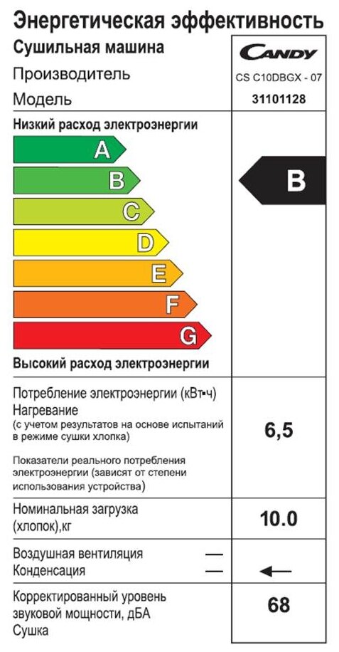 | Класс энергопотребления при сушке | B |