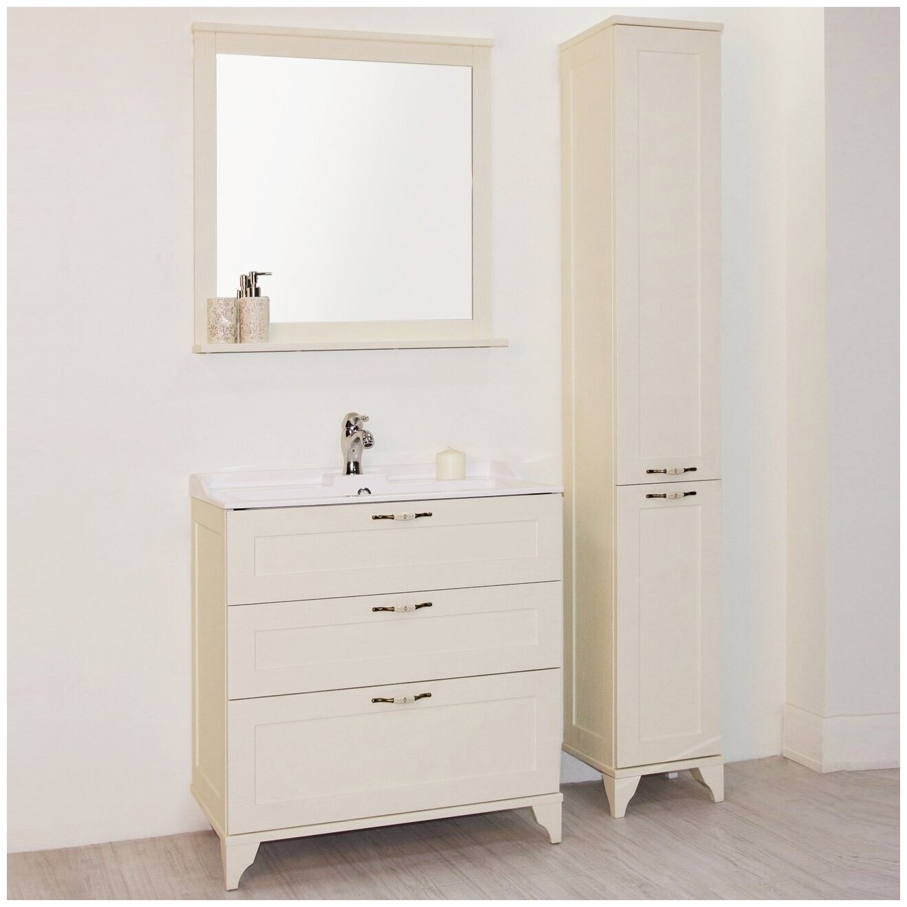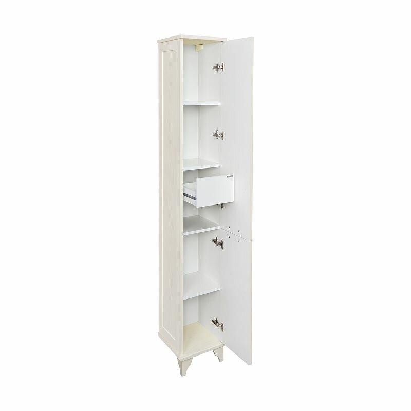 Шкаф-колонна для ванной комнаты (скрытые навесы – 2; петли со встроенным доводчиком – 5; ручка - 2; внутренний ящик - 1). Размеры: 312х1900х325 мм. Материал корпуса: МДФ. Материал фасадов: МДФ. Тип отделки: пленка. Цвет дуб бежевый
