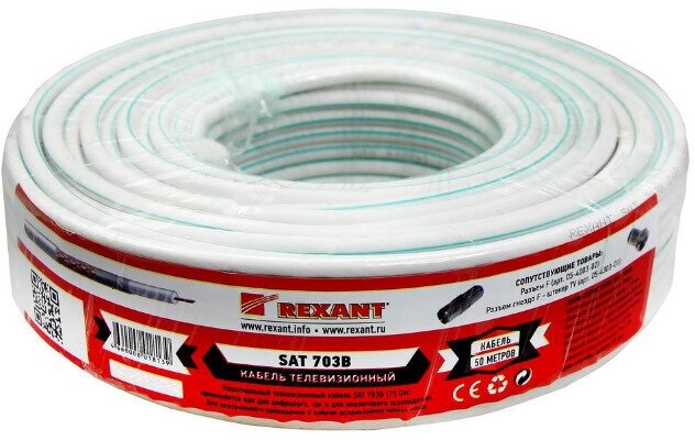 Техническое описание кабеля SAT 703 B 75 Ом REXANT. Кабель коаксиальный радиочастотный со вспененной полиэтиленовой изоляцией в ПВХ оболочке. Является самым качественным и эффективным решением для подключения спутниковых телевизионных систем, а также для подключения видеокамер наружного и внутреннего наблюдения. Используется внутри помещений. Конструкция: Внутренний проводник медная проволока Диаметр внутреннего проводника 1,1+/- 0,1 мм Диаметр по внутреннему диэлектрику 4,8 +/- 0,2 мм Диэлектрик, физически вспененный полиэтилен Экран из фольги наложен поверх диэлектрика Внешний проводник из медной проволоки в виде оплётки Диаметр проволоки в оплетке 0,12 - 0,15 мм Плотность оплетки 75% Наружный диаметр 6,8 +/- 0,2 мм Материал оболочки ПВХ Цвет оболочки белый Длина 50 метров Те
