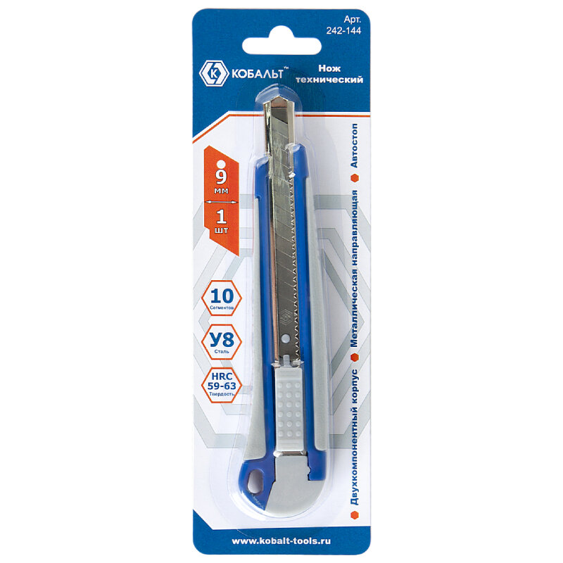 Нож технический кобальт с выдвижными лезвиями 9 мм предназначен для резки обоев, картона, бумаги, пленки, других мягких листовых материалов. Двухкомпонентный корпус, металлическая направляющая, автостоп. Лезвия изготовлены из высокоуглеродистой инструментальной стали У8 с закалкой до твердости 59 HRC. Ползунковый механизм с автоматической фиксацией лезвия для быстроты и удобства работы. Рекомендуется использовать лезвия Кобальт Арт. 242-038 или 911-529