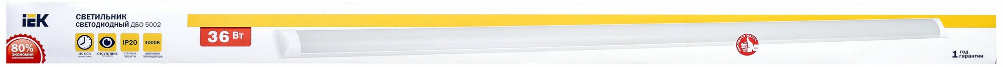 **Светильник линейный светодиодный IEK ДБО5002** подходит для создания подсветки в гараже, мастерской, на кухне или в шкафу. Используется как дополнительный источник света. Оснащен лампой мощностью 36 Вт. Она излучает нейтральный белый свет. Легко очищается от пыли сухой или влажности тряпкой.