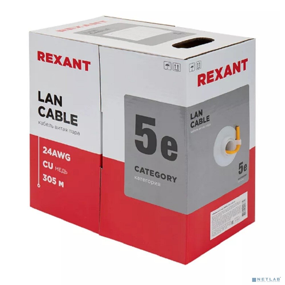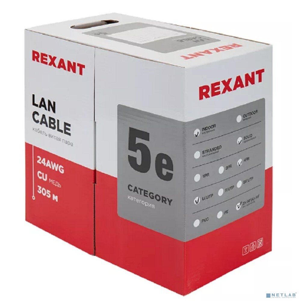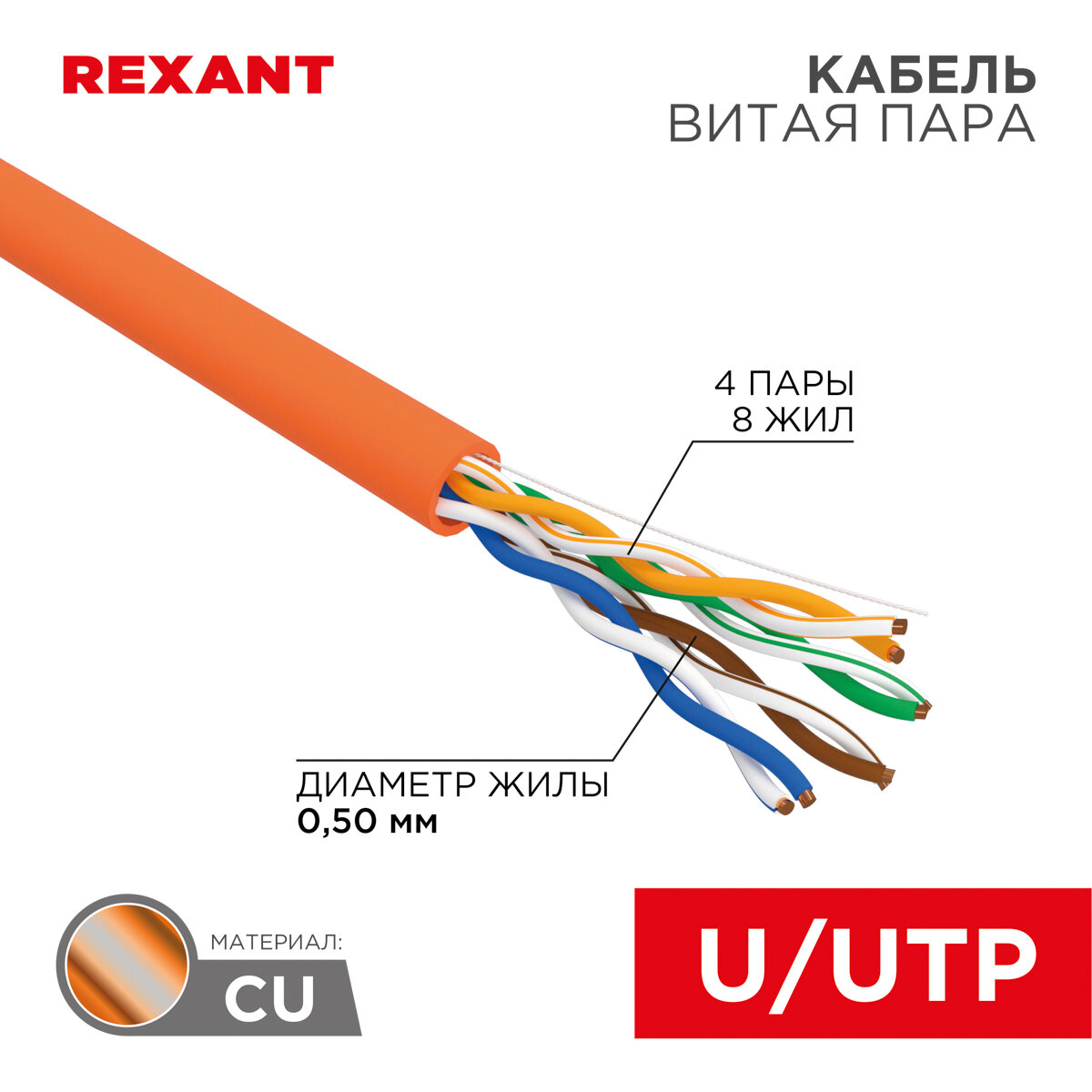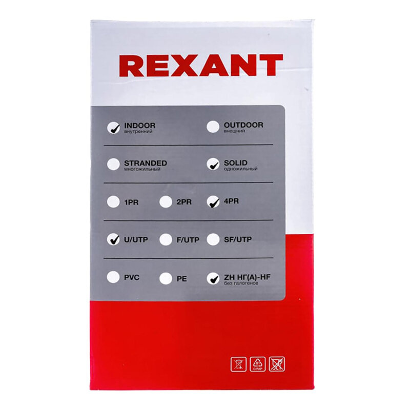 Кабель UTP 4PR 24AWG, CAT5e, нг(А)-HF (бухта 305 м) REXANT. Неэкранированная витая пара, материал проводника высокоочищенная бескислородная медь, калибр (24 AWG). Материал оболочки — нг(А)-HF, огнестойкий, не распространяющий горение при групповой прокладке, безгалогенный композит, пониженной пожарной опасности с низкой коррозионной активностью продуктов горения и тления.