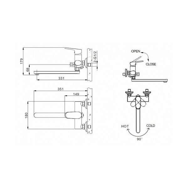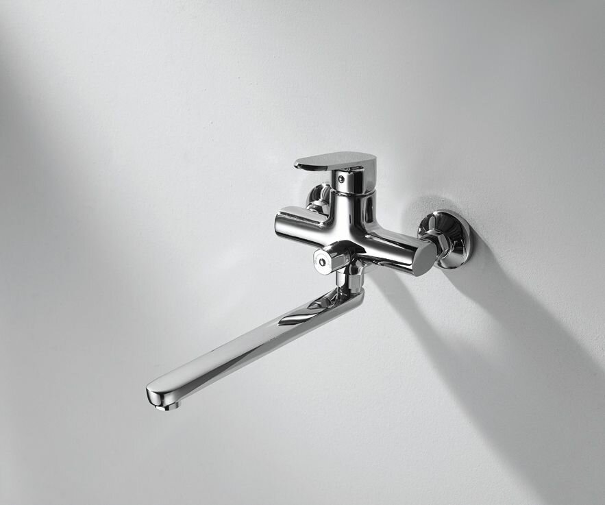 Классический смеситель в современном стиле предназначен для крепления на стене ванной или душа. Длинный поворотный литой излив обладает повышенной стойкостью к давлению воды. При необходимости он сдвигается в сторону, плоский рычаг управления при этом прост и удобен в использовании. Такая модель с керамическими пластинами гарантирует долговечность функционирования и возможность полноценного использования при любом, даже минимальном, давлении воды. Хромированная поверхность не требует сложного ухода, долгое время сохраняет нарядный, сияющий вид.