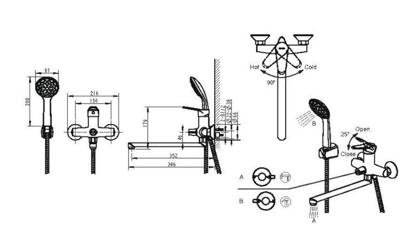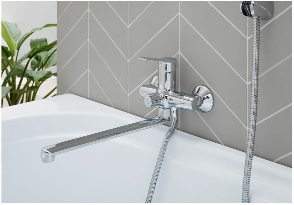 Смеситель для ванной настенный с длиным изливом 300 мм, Керамический картридж. Поворотный излив. Жесткая подводка. Цвет хром. В комплекте: смеситель, душевая лейка, гибкий шланг.