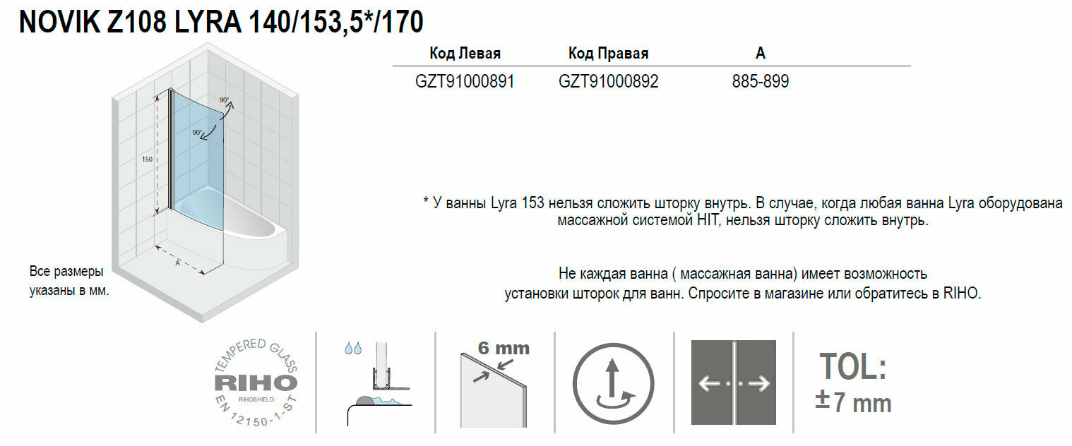 Шторка на ванну распашная Riho Novik Lyra Z108 90 R GZT91000892