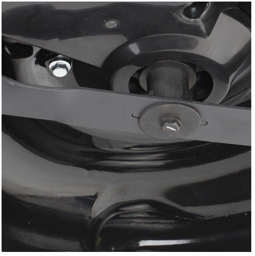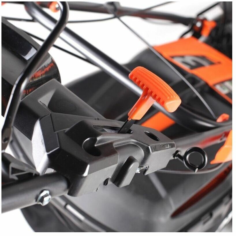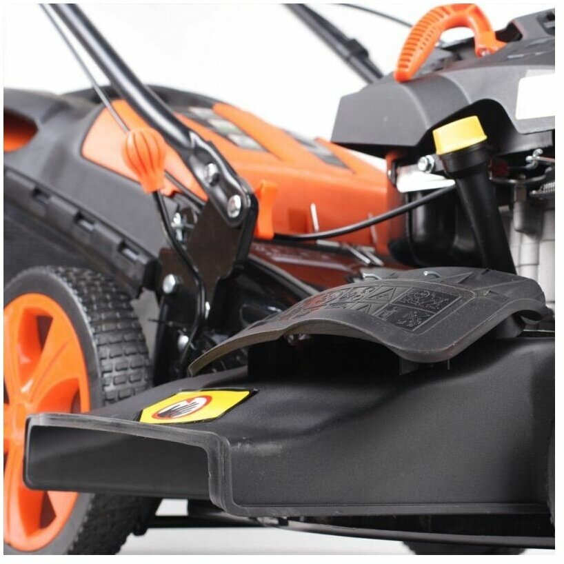 Мощный и очень тихий мотор с низким уровнем вибрации . Очень хорошо запускается , даже когда почти остынет нет необходимости нажимать кнопку подкачки топлива . Есть возможность регулировать скорость передвижения и обороты мотора рычажком на ручке . Даже на самых малых оборотах косит очень достойно и собирает скошенную траву в травосборник . Достаточно большие колёса , которые облегчают проезд по неровностям .