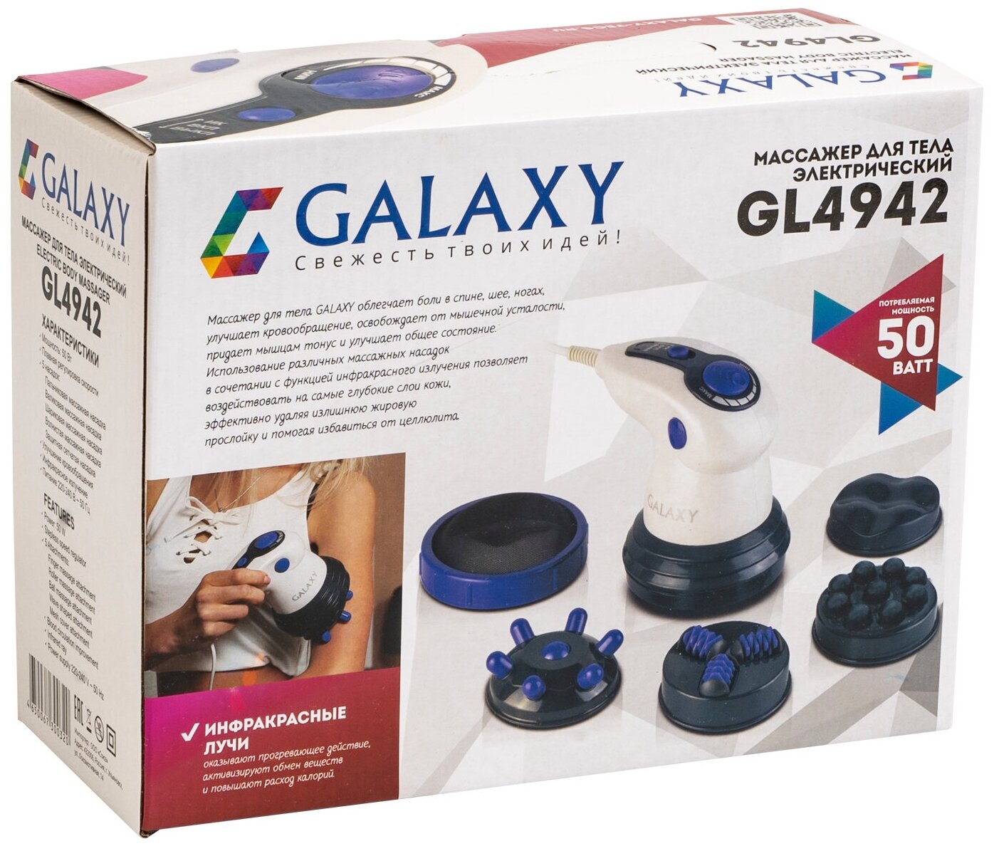 Обладающий доступной ценой массажер Galaxy GL4942 поможет снять усталость и боль с мышц спины, шеи, ног и рук и избавит от целлюлита. Корпус устройства изготовлен из прочного и долговечного пластика, оформлен в стильном цветовом сочетании белого и фиолетового. Galaxy GL4942 производит механический массаж, который можно сочетать с инфракрасным излучением. 3 режима регулируются с помощью удобного переключателя на корпусе массажера. 5 насадок сделают массаж разнообразным и максимально полезным. Прибор питается от сети, а его мощность приравнивается к 50 Вт