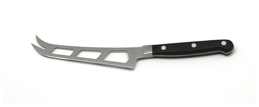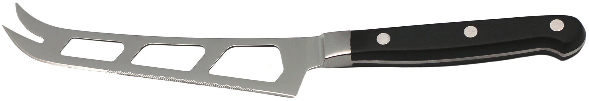 Нож для сыра, изготовленный из нержавеющей стали, обладает исключительным качеством. Он превосходно подходит для нарезки твердых и мягких сыров. Легкий нож с плавной зубчатой режущей кромкой. Острие оснащено вилкой, что позволяет ножом перекладывать нарезанные куски. В лезвии ножа имеются отверстия для уменьшения прилипания сыра к лезвию. Нож оснащен эргономичной ручкой из пластика, не скользит в руках и делает резку удобной и безопасной. Длина лезвия: 14 см.Ширина лезвия: 2,5 см.Общая длина ножа: 25 см.Материал лезвия: нержавеющая сталь.Материал рукояти: бакелит.Цвет рукояти: черный.