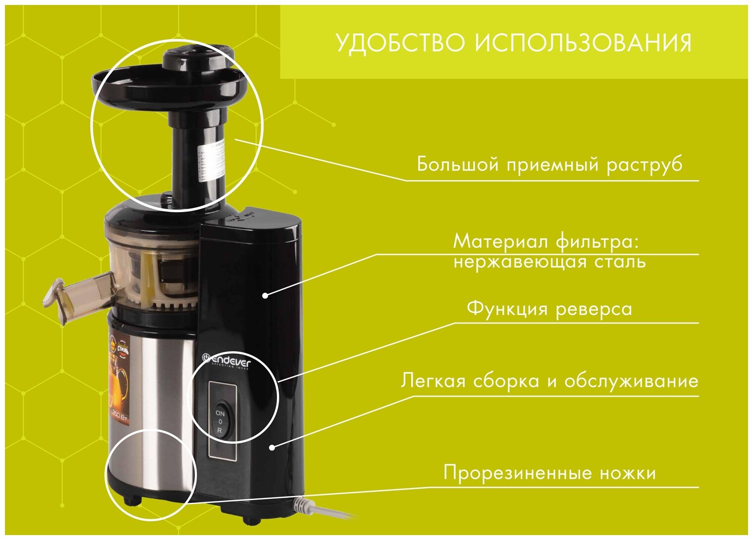 | Особенности | реверс, система "капля-стоп", система прямой подачи сока, автоматический выброс мякоти |