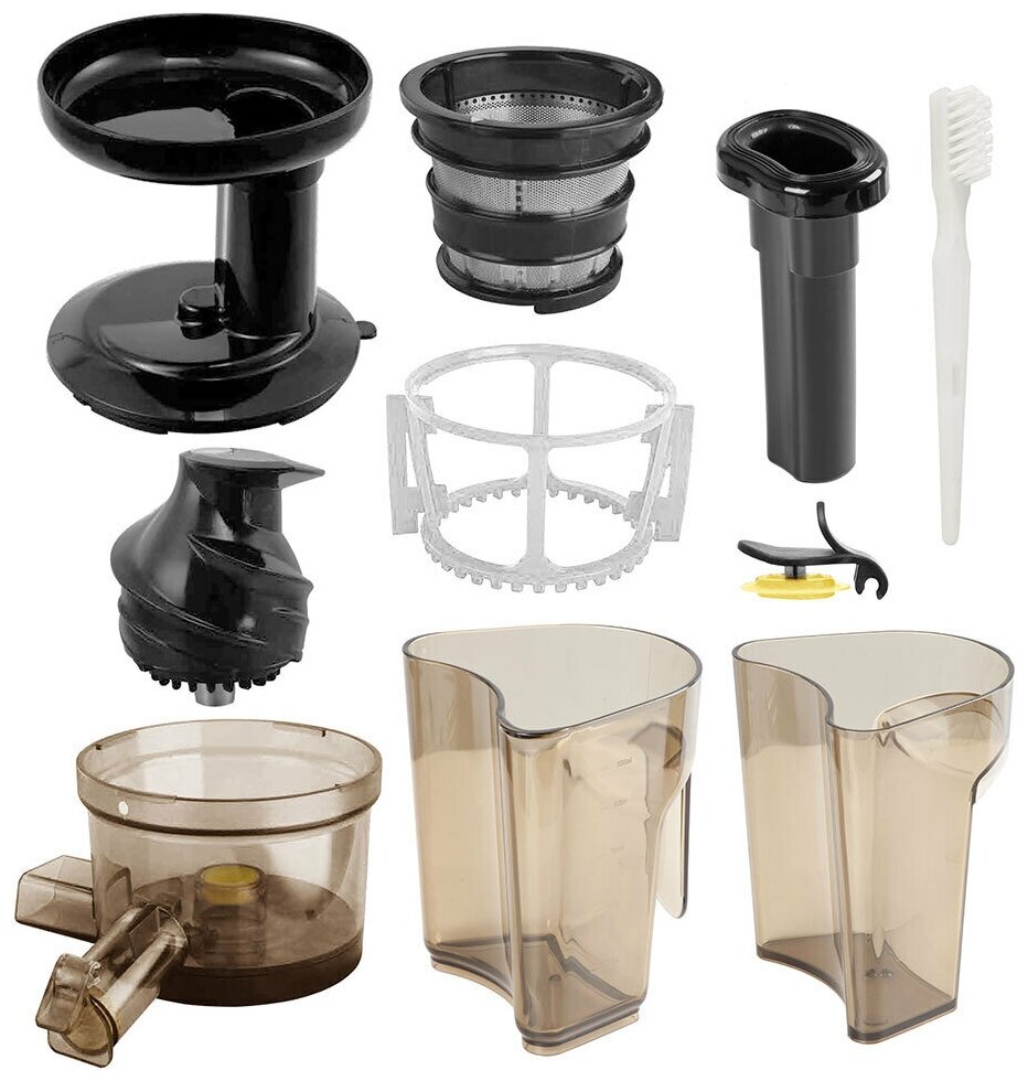 | Комплект поставки | Соковыжималка, загрузочный лоток, чаша, 2 резервуара для сока, толкатель, щеточка для чистки, шнек, документация |