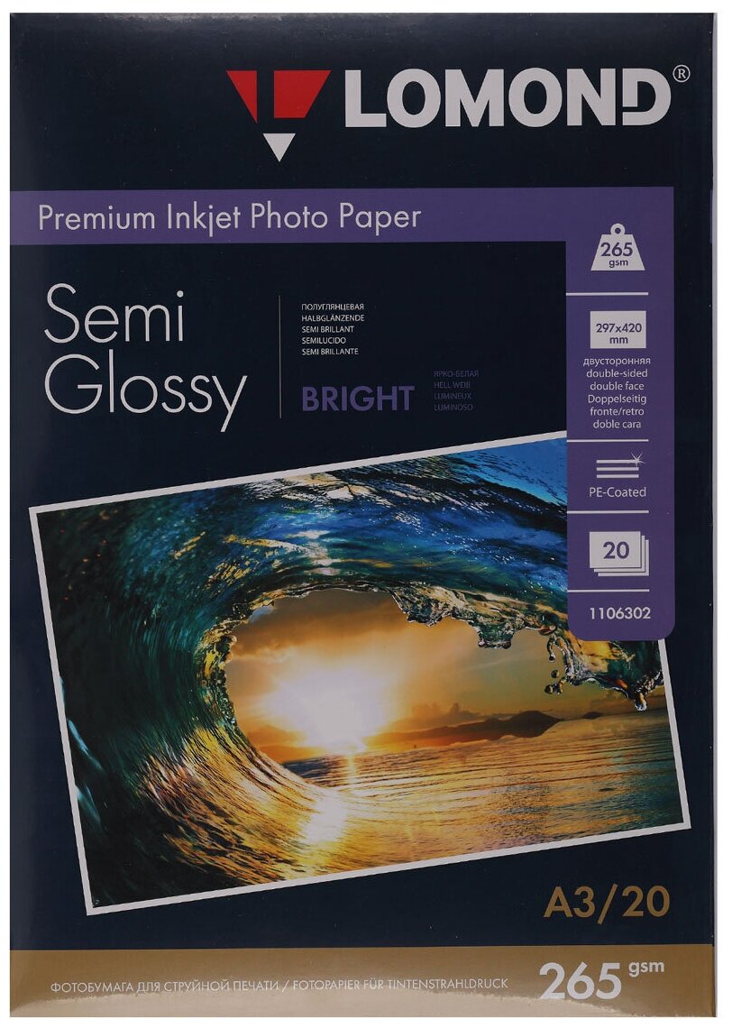 Фотобумага Lomond обеспечит вам великолепное качество фотопечати. Бумага изготовлена компанией Lomond и имеет формат A3. Экономичная упаковка включающая в себя 20 листов позволит вам значительно снизить себестоимость печати. При необходимости бумага хорошо режется до необходимого пользователю формата. Плотность фотобумаги Lomond представленной вашему вниманию составляет 265 мкм. Наличие специального покрытия на поверхности бумаги обеспечивает качество печати сопоставимое с качеством традиционной фотографии. Все изображения распечатанные принтером на фотобумаге Lomond будут выглядеть максимально зрелищно и реалистично. Бумага обеспечивает точную передачу цветов, чернила принтера на ней быстро засыхают, не оставляют размытостей, устойчивы к воздействию солнечного света. Фотобумага Lomond может похвастаться и великолепной долговечностью. Это именно та бумага, которая Вам необходима для создания качественных фотографий!