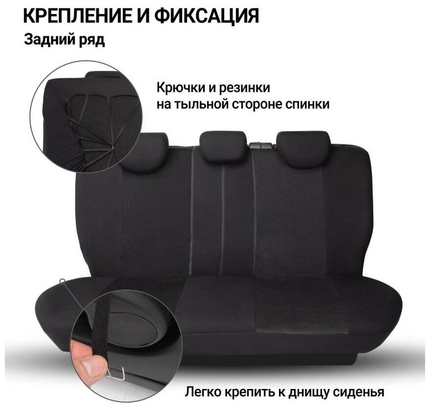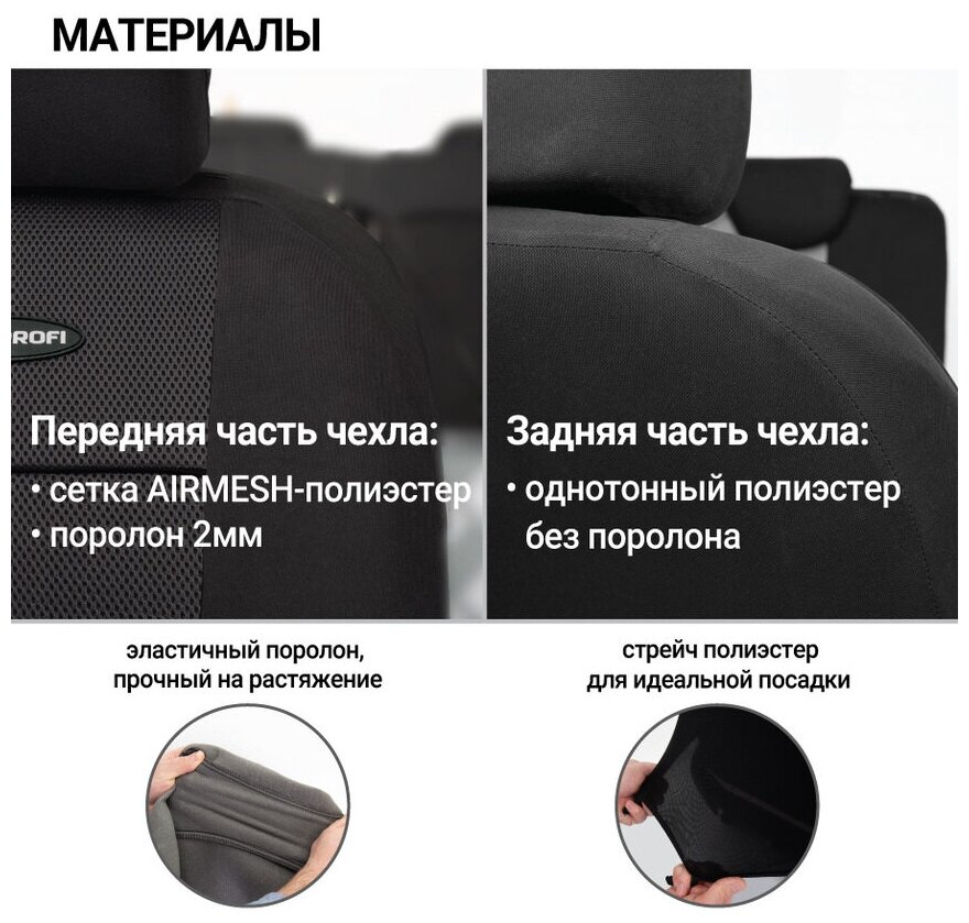 Универсальный размер подходит большинству автомобильных сидений. Чехлы имеют специальный распускаемый шов для боковых подушек Airbag на передних сиденьях