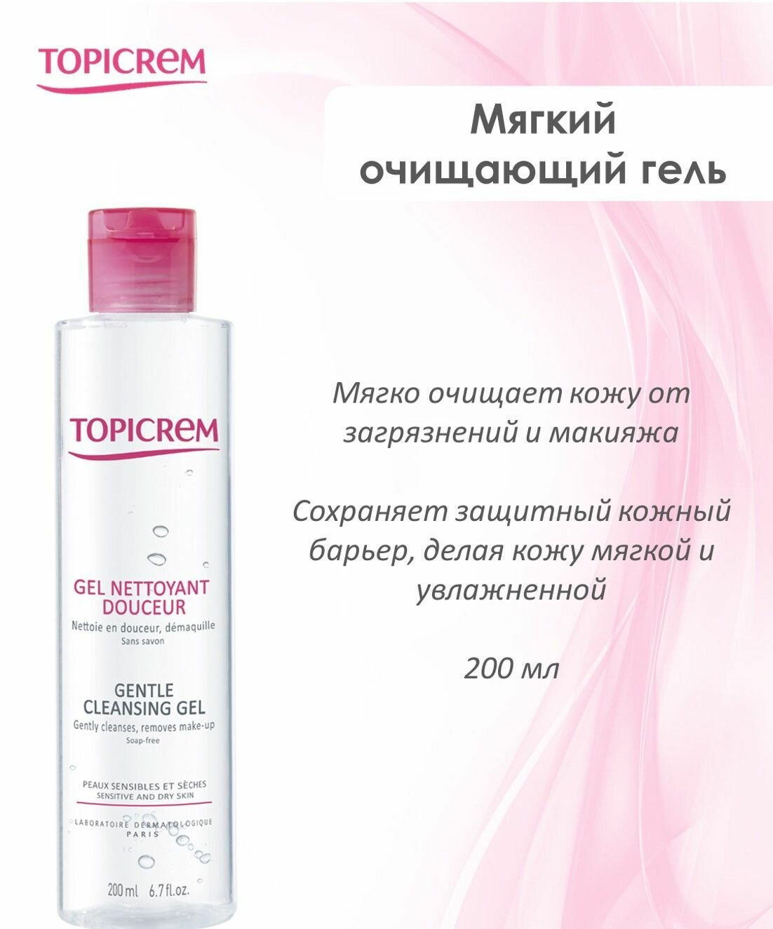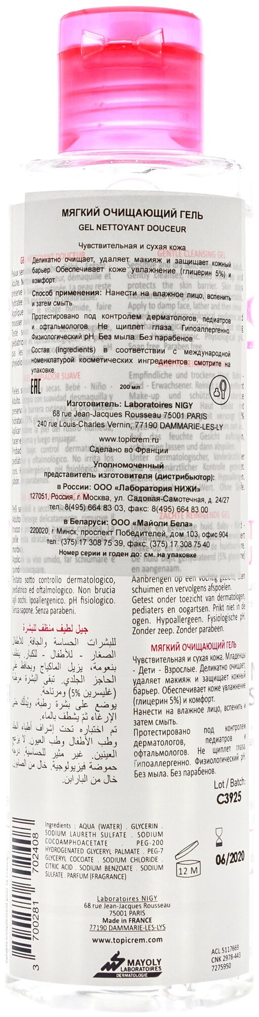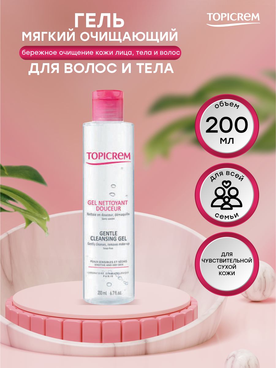 Эффективное, но мягкое очищающее средство для всей семьи - Гель Топикрем. Формула без мыла разработана с учетом особенностей сухой и чувствительной кожи. Средство очищает кожу от загрязнений и макияжа, подходит детям и взрослым, не сушит кожу и не щиплет глаза. Topicrem Gel Nettoyant Douceur обладает физиологическим уровнем рН, не нарушает гидролипидную мантию эпидермиса. Гель прошел дерматологический, педиатрический и офтальмологический контроль. Активные компоненты: глицерин (5%) интенсивно увлажняет, смягчает и защищает кожу; мягкие ПАВ нежно очищают, не повреждая естественный защитный слой кожи, снижают раздражение. без красителей без мыла без парабенов гипоаллергенно