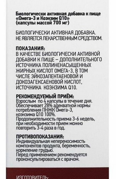 | Способ применения и дозы | взрослым по 4 капсулы в течение дня, во время еды, обеспечивает 28% адекватной нормы потребления ПНЖК Омега-3, коэнзима Q10 100%, продолжительность приема 3-6 недель, при необходимости прием можно повторить 3-4 раза в год |