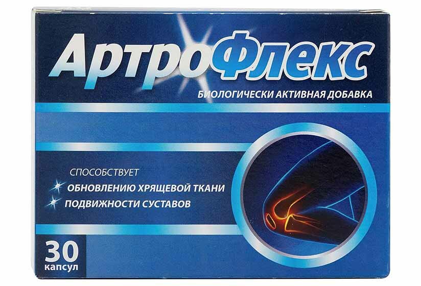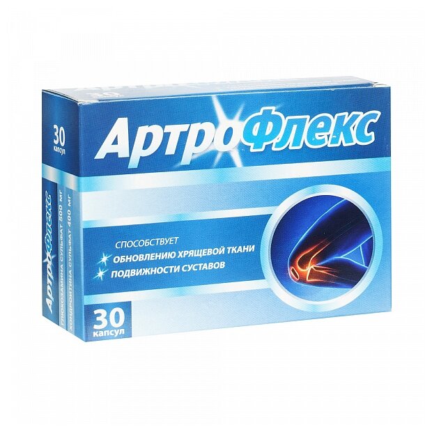 Артрофлекс способствует обновлению хрящевой ткани, подвижности суставов. Пищевая ценность на 1 капсулу Белки 0,6992 г., жиры 0,4765 г., углеводы 0,8508 г. Калорийность на 1 капсулу : 10,2758 ккал/42,9939472 кДж. Биологическое действие компонентов Глюкозамина и хондроитина сульфат участвуют в биосинтезе соединительной ткани, предотвращают процессы деструкции хряща и стимулируют регенерацию хрящевой ткани. Глюкозамина сульфат. Способствует уменьшению болезненности и увеличению подвижности суставов при остеоартрозе, а также регенерации хрящевых поверхностей суставной сумки. Увеличивает продукцию внутрисуставной жидкости, стимулирует синтез гликозаминогликанов, в том числе за счет сульфатного иона ( сульфатированный глюкозамин ), поскольку гликозаминогликаны являются эфирами серной кислоты. Сульфатированная форма глюкозамина защишает суставной хрящ от действия некоторых нпвп, оказывает собственное умеренное противовоспалительное действие, является предшественником гексозамина. Хондроитина сульфат. Хондроитина сульфат (и его производные) стимулирует образование гиалуронона, синтез протеогликанов и коллагена II типа, а также защищает матрикс хрящевой ткани от ферментативного расщепления ( путем подавления активности гиалуронидазы ) и от повреждающего действия свободных радикалов, уменьшает потребность в нпвп.