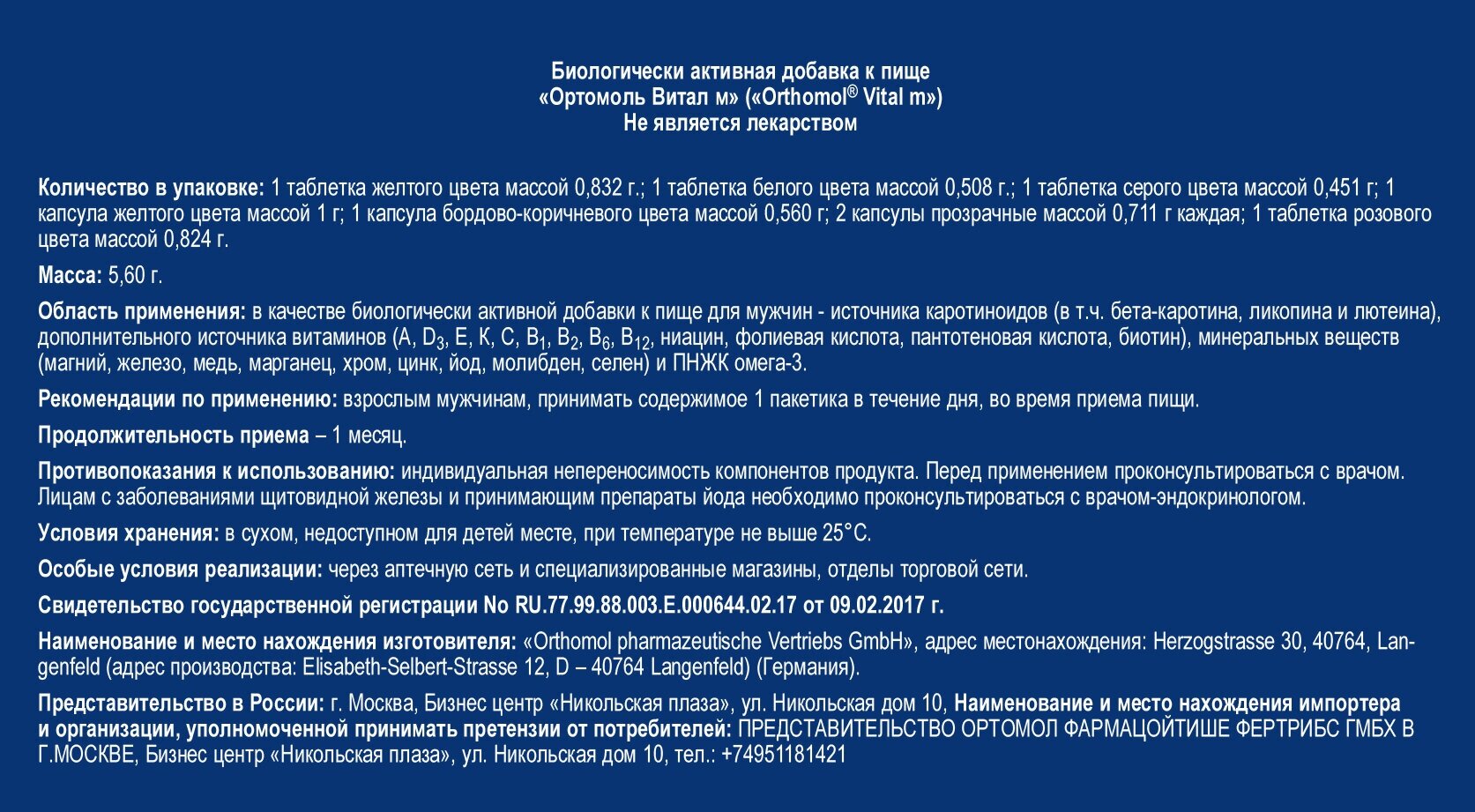 Ортомол Витал М это возможность повышения общего качества жизни для каждого мужчины. Orthomol Vital M содержит уникальную дозировку жирных кислот, витаминов, микроэлементов (в основном, конечно, необходимого для мужчин кальция и цинка), адаптируемый под любой организм. Комплекс Ортомол Витал М отлично восполняет нехватку организма в необходимых микронутриентах, нормализует их обмен и специальную выработку. Препарат Orthomol Vital M помогает восстановить структуру вашей кожи, а также волос и ногтей. Представляем Ортомол Витал М современный ортомолекулярный комплекс для мужчин. Orthomol Vital M можно употреблять в профилактических целях при увеличении обычных нагрузок. Современный мужчина живет в очень сложном мире, полном стрессов и чрезмерно высоких нагрузок. Самостоятельно восстанавливать свои силы может далеко не каждый, тем более, что обычный рацион мужчины ему это попросту не позволяет. Ортомол Витал М разработан учеными с учетом всех особенностей организма представителей сильной половины человечества. Показаниями к применению препарата Orthomol Vital M могут быть не только хронические болезни и общая усталость организма, но и обыкновенный авитаминоз и стресс. По причине стрессов среди средней возрастной группы сильной половины человечества отмечается такой высокий процент инфарктов, инсультов и хронических расстройств разной степени, не говоря уже о рядовом эмоциональном выгорании. АКТИВНЫЕ КОМПОНЕНТЫ: Глюконат железа, разделитель диоксид кремния, подсластитель цикламат натрия, молибдат натрия, краситель оксид железа, растительное масло (частично отвержденное), разделитель соли магния пищевых жирных кислот, покрытие гидроксипропилметилцеллюлоза, покрытие гидроксипропилцеллюлоза, Витамин D3, Витамин B12, лютеин, сульфат меди, бета-каротин, йодид калия, никотинамид, экстракт томатов, наполнитель фосфат кальция, краситель диоксид титана, Витамин K1, кукурузный крахмал, глюконат цинка, Витамин А-пальмитат, эмульгатор соевый лецитин, кальция D - пантотенат, наполнитель микрокристаллическая целлюлоза, витамин E, обогащенный ликопином, сорбит, Витамин В1 - мононитрат, сульфат марганца, экстракт цитрусовых, хлорид хрома (III), L-аскорбиновая кислота, разделитель тальк, желатин, подсластитель аспартам, L-аскорбат натрия, фолиевая кислота, селенат натрия, краситель медные комплексы хлорофиллинов, регулятор влажности глицерин, Рыбий жир, D - биотин,Витамин В2, карбонат магния, ароматизатор, Витамин В6 - гидрохлорид Ортомол Витал М произведен в Германии. Orthomol Vital M сертифицирован в соответствии с ISO 22000/GMP. Ортомол Витал М не содержит глютен и лактозу. ПРИМЕНЕНИЕ: Взрослым мужчинам принимать содержимое 1 пакетика в течение дня, во время приема пищи. Внимание! БАД, не является лекарственным средством. Противопоказания: индивидуальная непереносимость компонентов, беременность, кормление грудью, возраст до 18. Перед применением проконсультируйтесь с врачом.