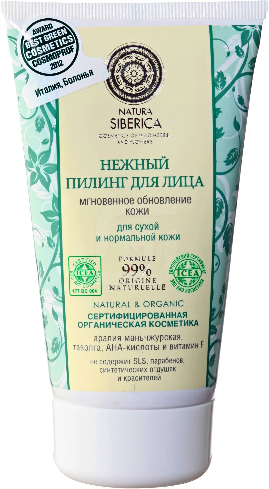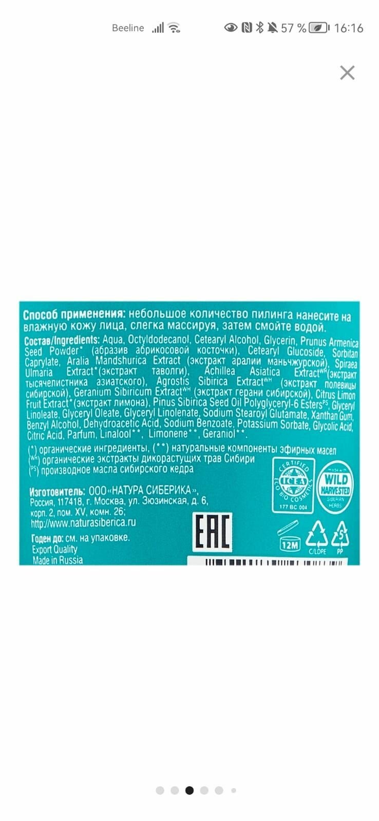 | Состав | aqua, cetearyl alcohol, melilotus albus flower/leaf/stem extract (экстракт донника), octyldodecanol, caprylic/capric triglyceride, glycerin, prunus armeniaca seed powder (абразив абрикосовой косточки), coco-caprylate/caprate, helianthus annuus seed oil (масло подсолнечника), cetearyl glucoside, rhodiola rosea root water (гидролат родиолы розовой), tocopherol, pinus sibirica seed oilwh (масло кедровых орехов), oenothera biennis oil (масло примулы вечерней), linum usitatissimum seed oil (масло льна), chamomilla recutita flower extract (экстракт ромашки), calendula officinalis flower extract (экстракт календулы), scutellaria baicalensis root extract (экстракт шлемника байкальского), aquilegia sibirica flower/leaf/stem extractwh (экстракт водосбора сибирского), schizandra chinensis extractwh (экстракт лимонника нанайского), dasiphora fruticosa extractwh (экстракт курильского чая), sodium hyaluronate, sodium stearoyl glutamate, xanthan gum, benzyl alcohol, dehydroacetic acid, sodium benzoate, potassium sorbate, citric acid, parfum, limonene, linalool |