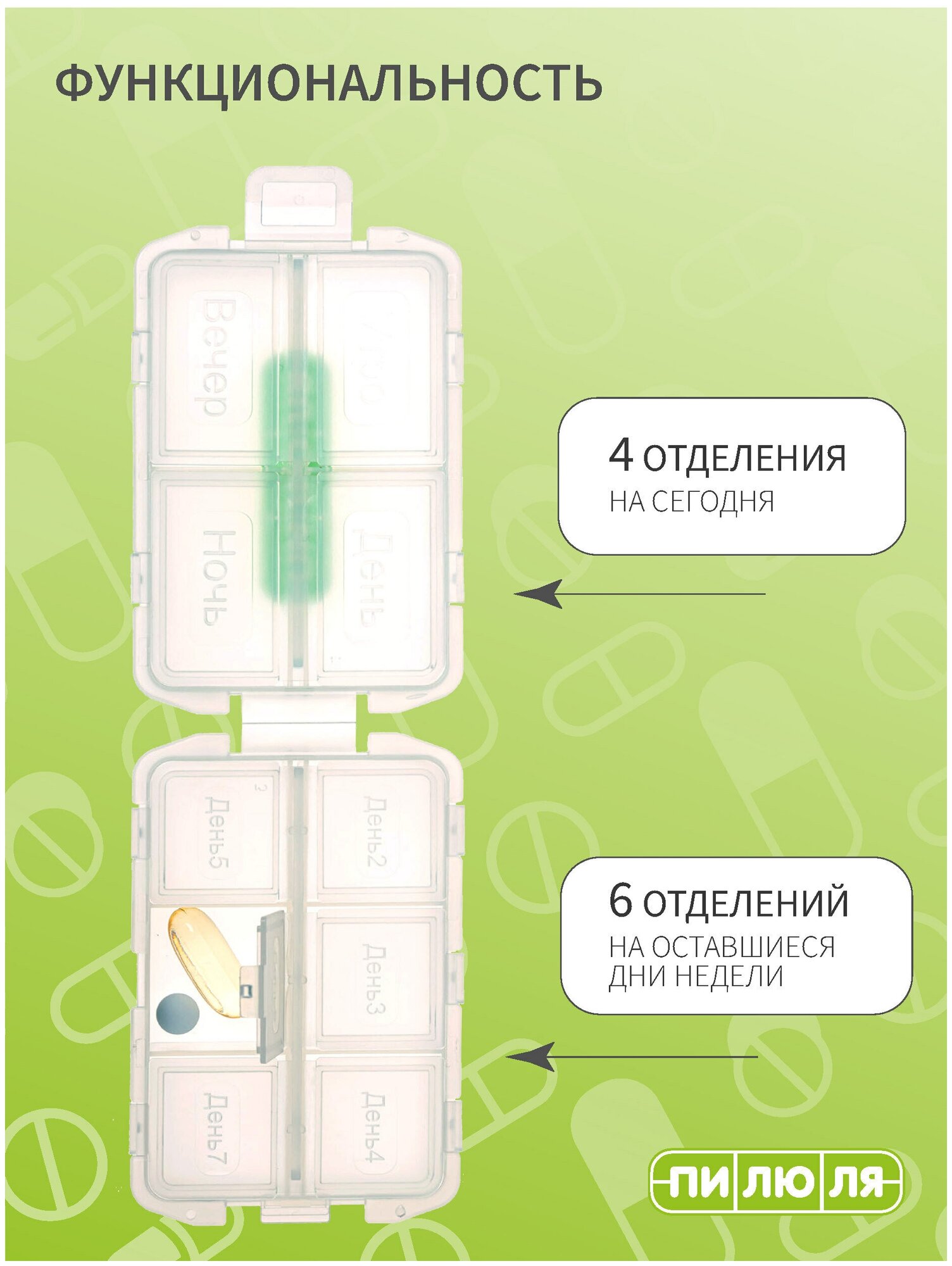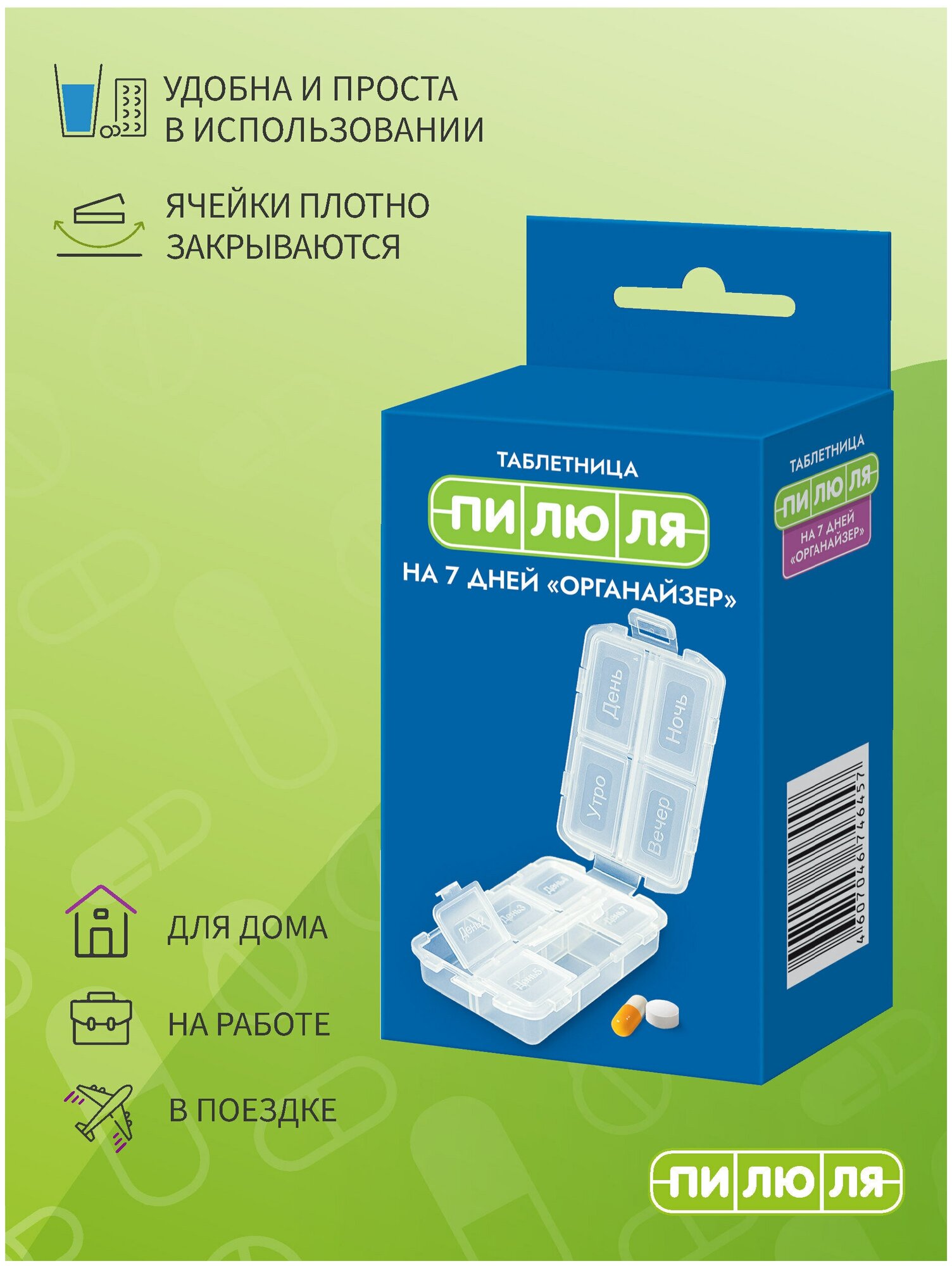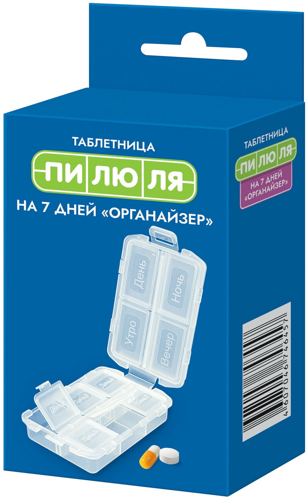 **Описание товара: Таблетница-органайзер Пилюля — идеальное решение для хранения медикаментов и витаминов на каждый день!**Представляем вам таблетницу-органайзер Пилюля, разработанную для легкого и удобного хранения ваших медикаментов и витаминов. Эта функциональная таблетница состоит из двух аккуратных блоков, что обеспечивает максимальную организацию и доступность ваших препаратов.**Что предлагает таблетница Пилюля?**- **7 дней на выбор:** Первый блок включает 6 пронумерованных отделений, идеально подходящих для хранения суточной дозы лекарств или витаминов на каждый день. Второй блок предлагает 4 отделения, что позволяет удобно распределять препараты по режиму приема: утро, день, вечер и ночь.- **Безопасные материалы:** Изготовлена из высококачественного, безопасного и легко моющегося пластика, что обеспечивает исключительную долговечность и простоту ухода.- **Удобство в использовании:** Легко открывается и закрывается, что делает процесс приема медикаментов простым и комфортным. Идеальна для людей всех возрастов, включая пожилых и детей.- **Компактный дизайн:** Таблетница легко помещается в сумке или кармане, что позволяет всегда иметь под рукой необходимые препараты во время поездок или на работе. С таблетницей-органайзером Пилюля вы сможете быть уверены в правильном и своевременном приеме ваших медикаментов. Порядок в ваших лекарствах стал еще более доступным! Не упустите возможность сделать свое здоровье в приоритете с нашим удобным и стильным органайзером для таблеток. Заказывайте прямо сейчас и забудьте о путанице с лекарствами!