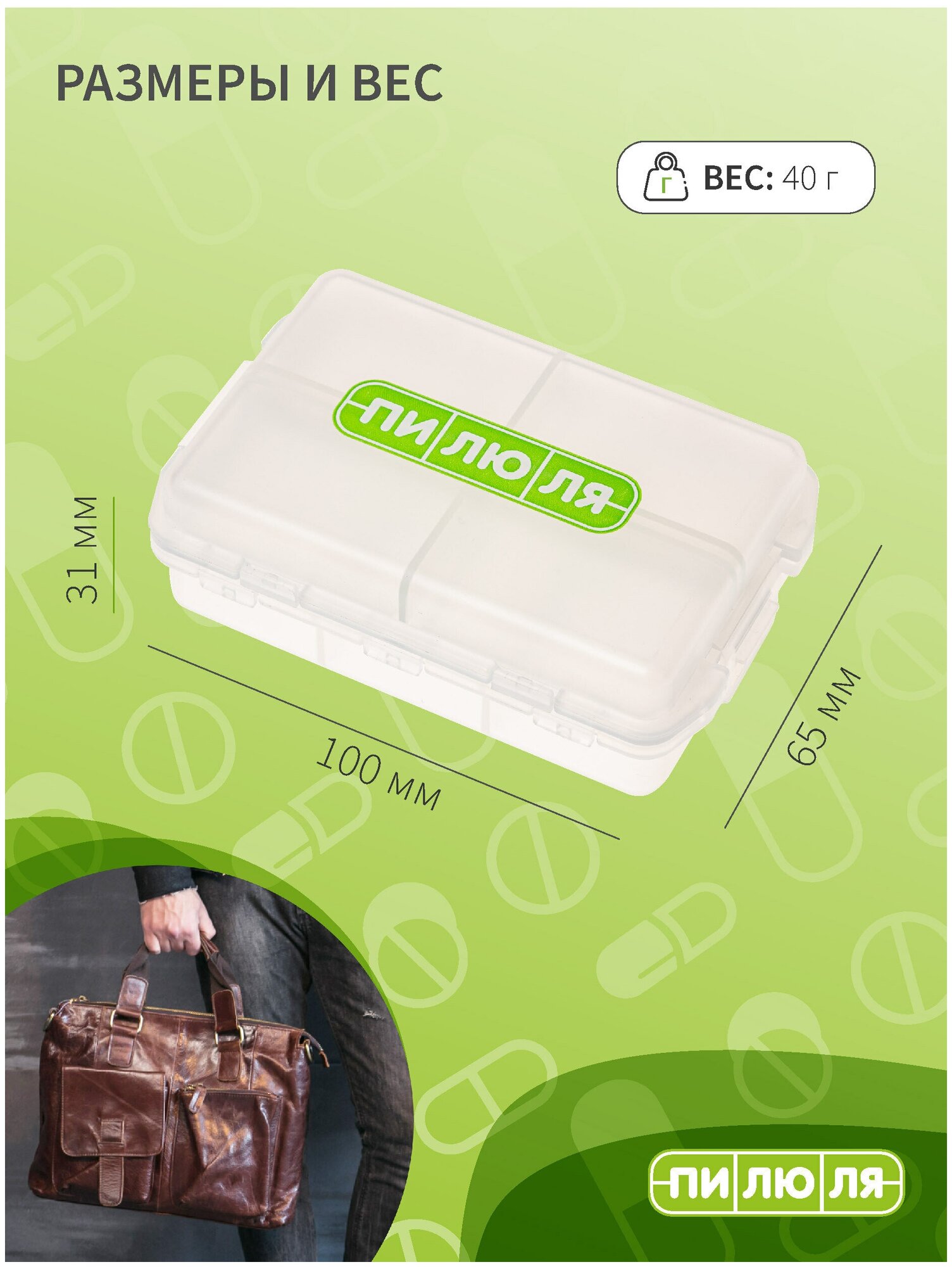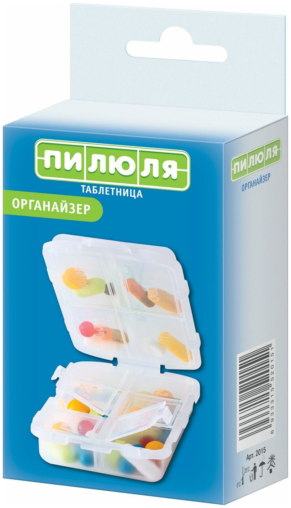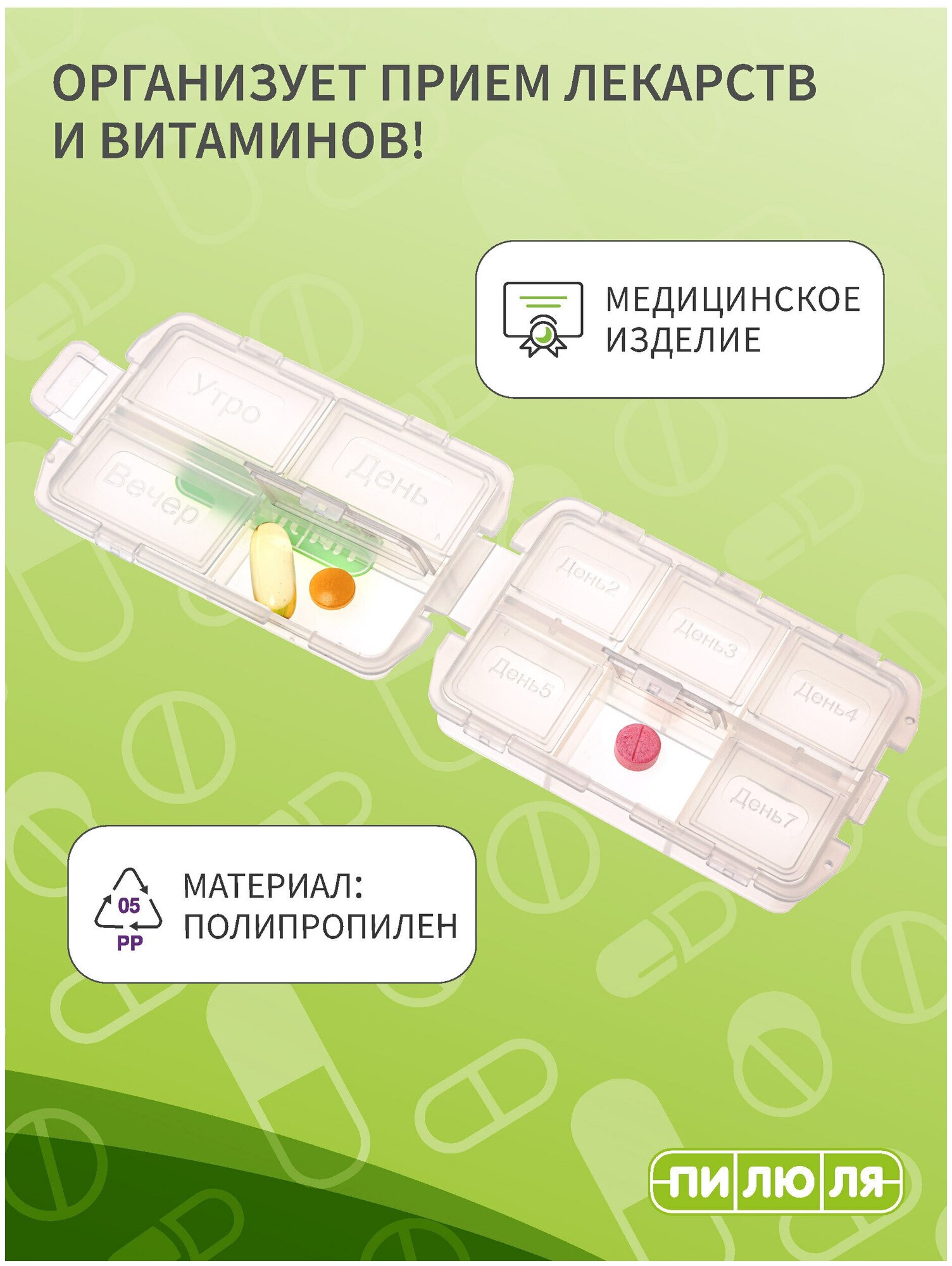 **Описание товара: Таблетница-органайзер Пилюля — идеальное решение для хранения медикаментов и витаминов на каждый день!**Представляем вам таблетницу-органайзер Пилюля, разработанную для легкого и удобного хранения ваших медикаментов и витаминов. Эта функциональная таблетница состоит из двух аккуратных блоков, что обеспечивает максимальную организацию и доступность ваших препаратов.**Что предлагает таблетница Пилюля?**- **7 дней на выбор:** Первый блок включает 6 пронумерованных отделений, идеально подходящих для хранения суточной дозы лекарств или витаминов на каждый день. Второй блок предлагает 4 отделения, что позволяет удобно распределять препараты по режиму приема: утро, день, вечер и ночь.- **Безопасные материалы:** Изготовлена из высококачественного, безопасного и легко моющегося пластика, что обеспечивает исключительную долговечность и простоту ухода.- **Удобство в использовании:** Легко открывается и закрывается, что делает процесс приема медикаментов простым и комфортным. Идеальна для людей всех возрастов, включая пожилых и детей.- **Компактный дизайн:** Таблетница легко помещается в сумке или кармане, что позволяет всегда иметь под рукой необходимые препараты во время поездок или на работе. С таблетницей-органайзером Пилюля вы сможете быть уверены в правильном и своевременном приеме ваших медикаментов. Порядок в ваших лекарствах стал еще более доступным! Не упустите возможность сделать свое здоровье в приоритете с нашим удобным и стильным органайзером для таблеток. Заказывайте прямо сейчас и забудьте о путанице с лекарствами!