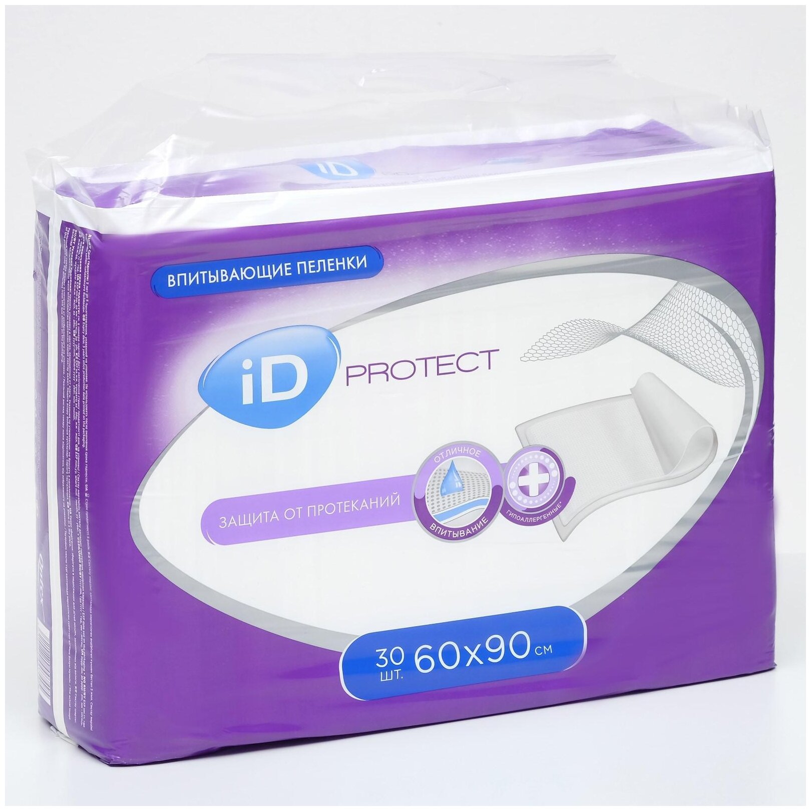 Впитывающие пеленки iD Protect универсальны в использовании: они могут служить в качестве дополнительной защиты различных поверхностей (например, постельного белья, мебели) от намокания при использовании вместе с подгузниками, впитывающими трусами и урологическими прокладками, при смене подгузников, а также при проведении различных процедур. Они отлично впитывают и эффективно распределяют жидкость. Верхний слой пеленок выполнен из мягких, как хлопок, материалов, что обеспечивает комфорт при использовании, а нижний слой – из полиэтиленовой пленки, что исключает протекания.