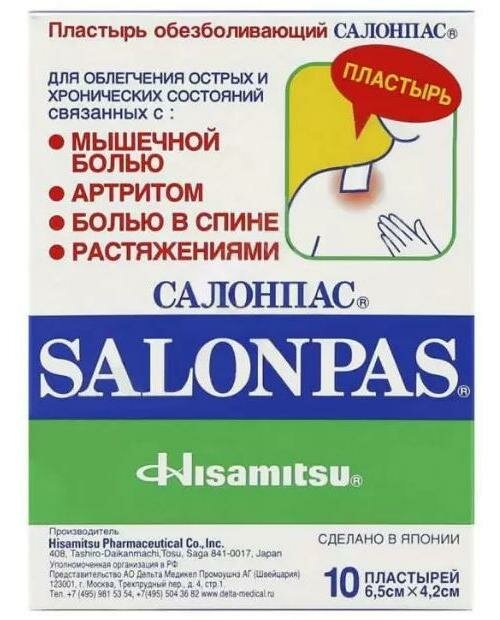 Салонпас — это обезболивающие, противовоспалительные пластыри с длительным сроком действия. Пластыри выпускается японской компанией «Хисамицу», уже много лет являющейся одним из мировых лидеров в области разработки и производства противовоспалительных средств и препаратов.